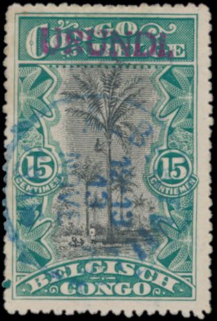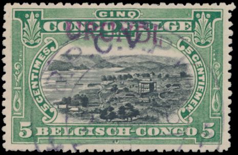3343 0 imageN° 18 "15c. green" with overprint "TOMBEUR", "URUNDI" cancelled "ALBERTVILLE 13 NOVE 16", rare, on the back small dual cancel of the CBE (Commission Belge d'Expertise), vf(Image 1) (All Images)