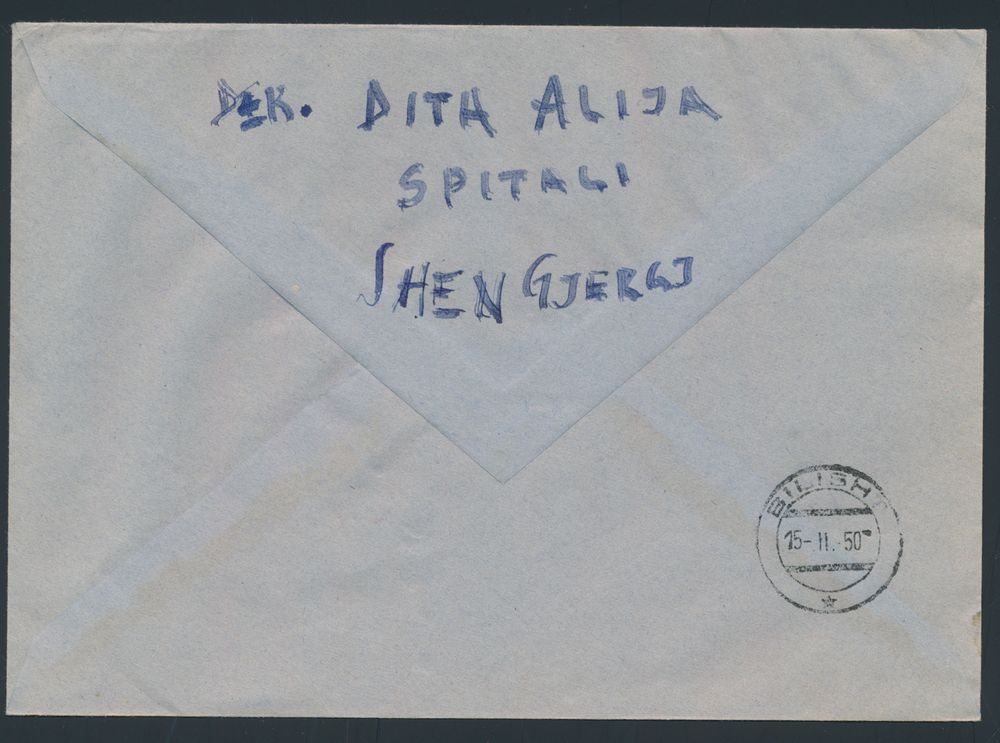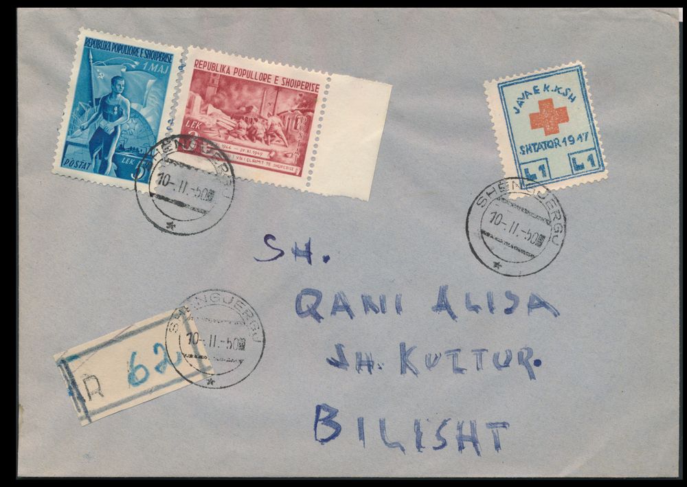 3478 image1950, registered letter from Sjengjergj to Bilisht, including surcharge stamp Red Cross (Mi N° 1, stamp value €450), rare, vf.(Image 1) (Image 2)