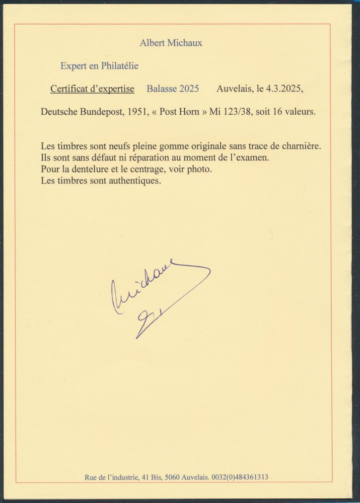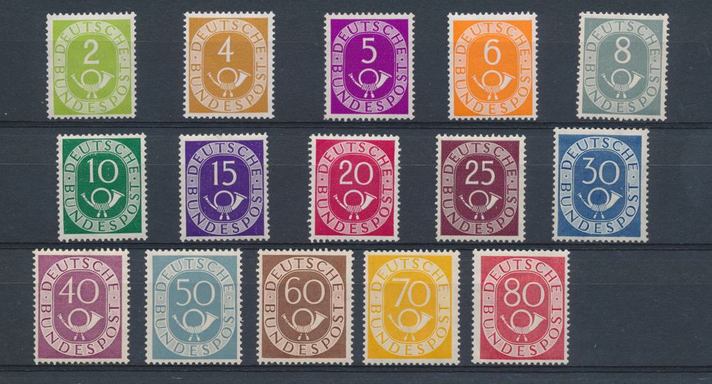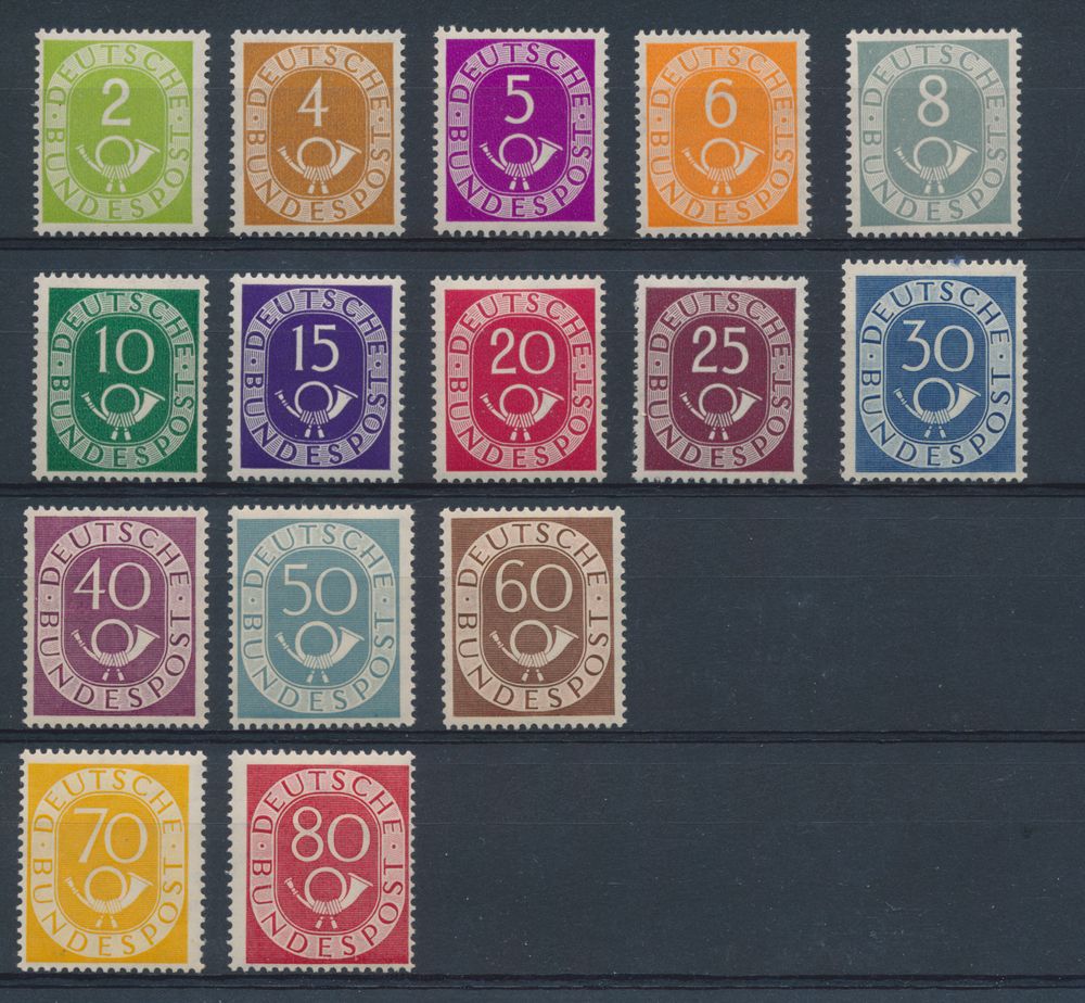 3579 nh imageN° 123/38 '1951 Posthorn' with photo certificate, many important stamps expertised Schelegel (25, 40, 50, 60, 70- and 90 Pf), the 80 Pf damaged, to be checked) all others very nice (Mi €2,200)(Image 1) (Image 2) (Image 3)