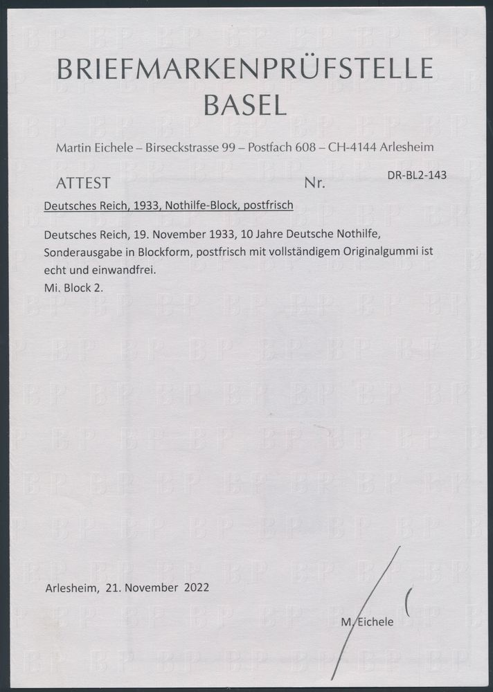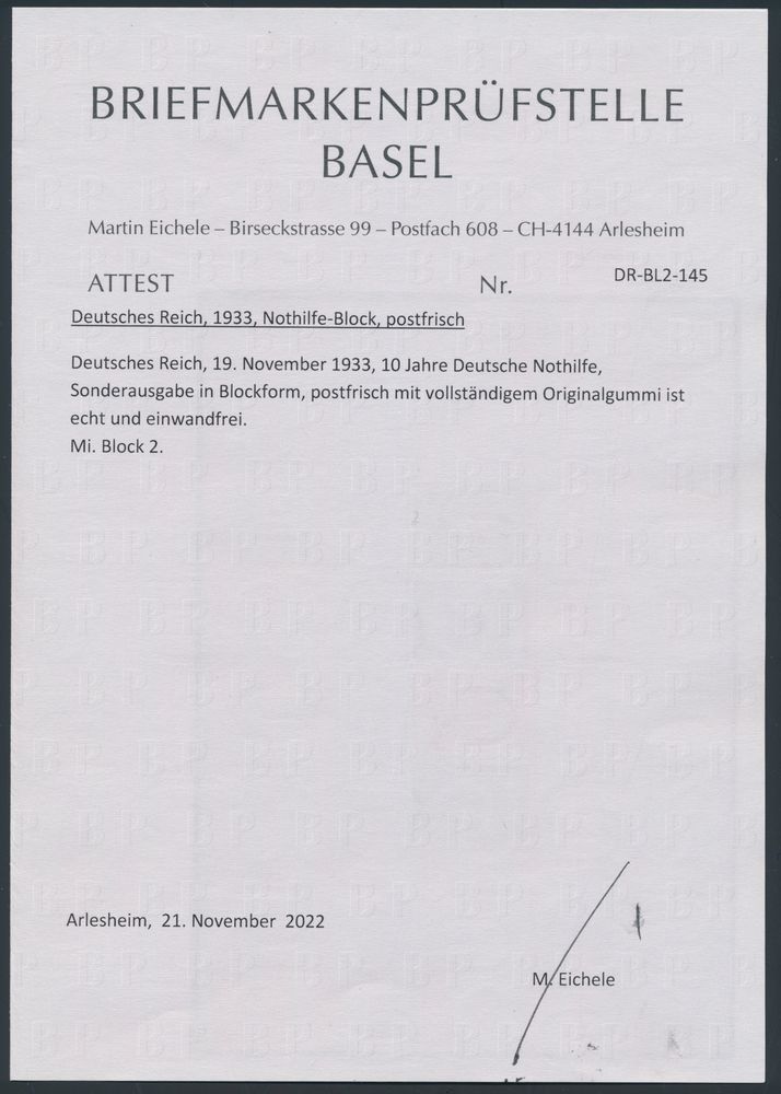 3567 nh imageBL 2 '1933, 10 Years Nothilfe', with certificate BPSB, vf (Mi €6,000)(Image 1) (Image 2)