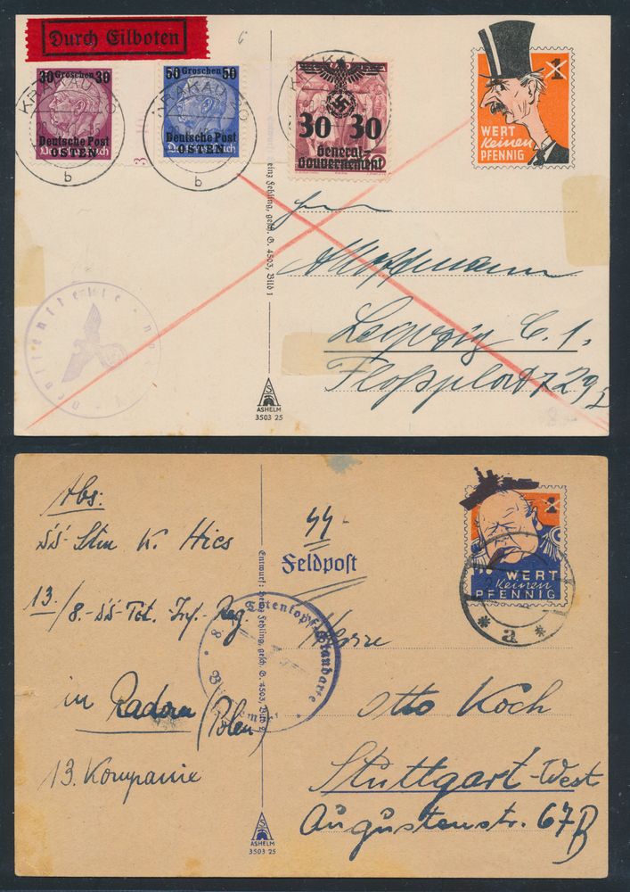 3578 PWS image2 Feldpost cards propaganda (1x SS card) Churchill and Chamberlain, both sent from Poland, vf.(Image 1) (All Images)