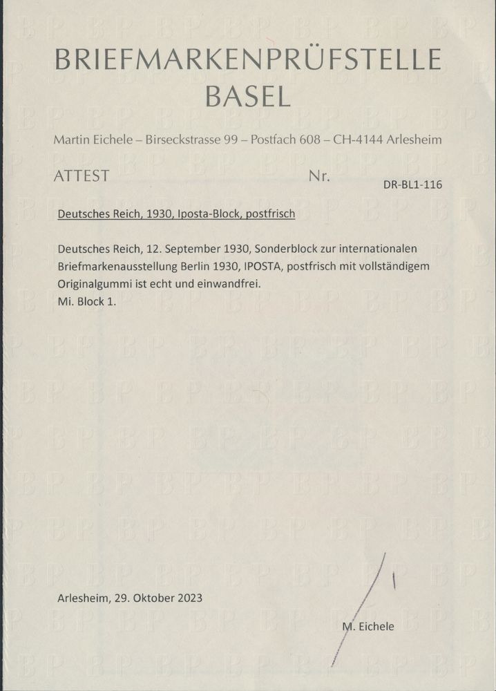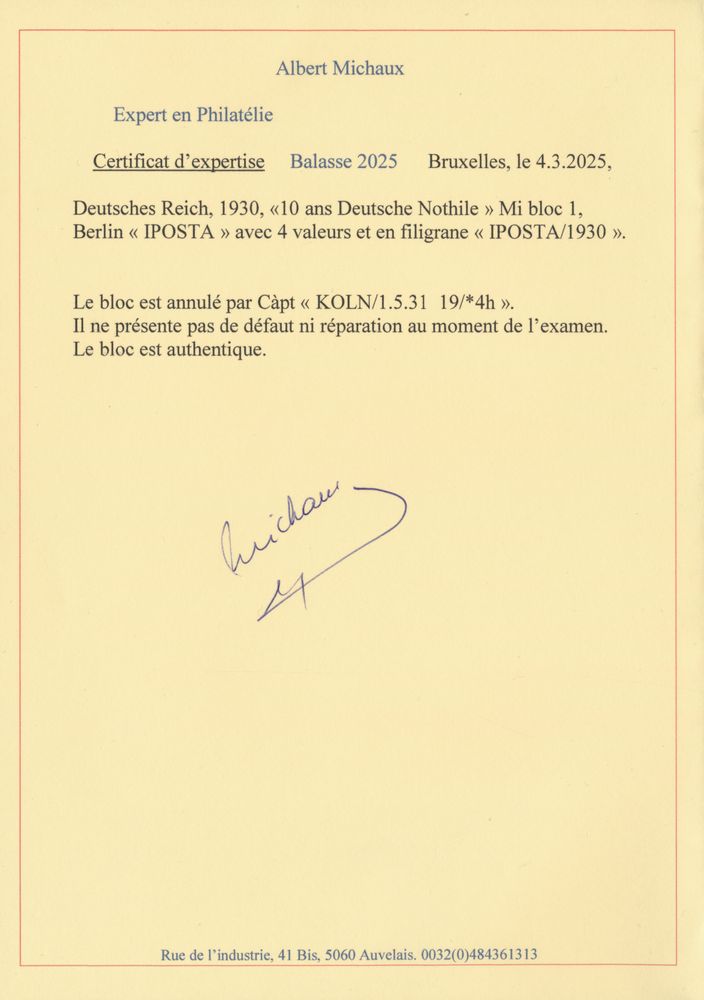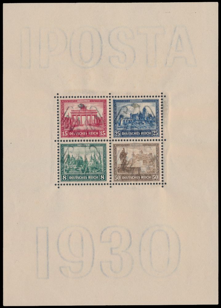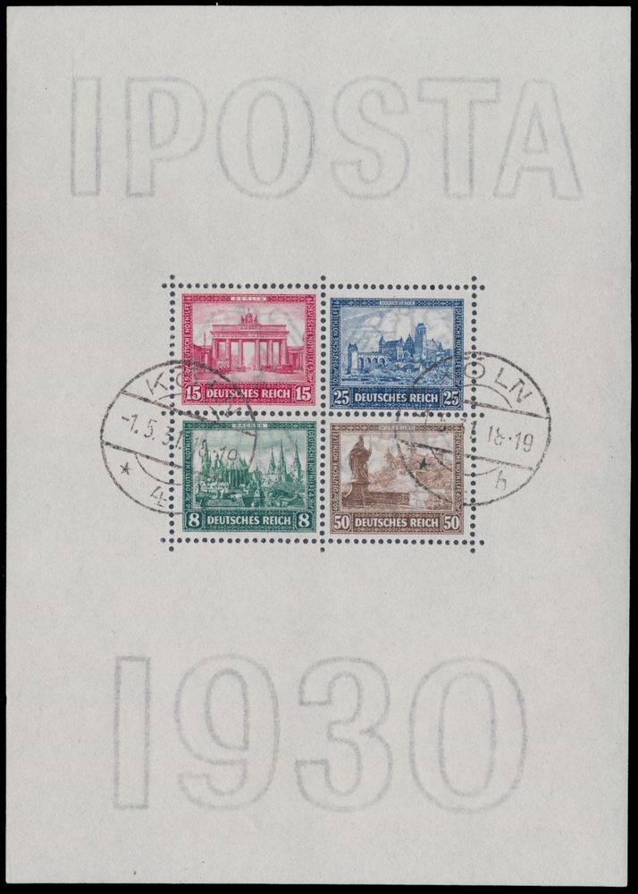 3566 0 imageBL 1 '1930 IPOSTA, cancelled Cologne' with photo certificate, vf (Mi €2,000)(Image 1) (Image 2)