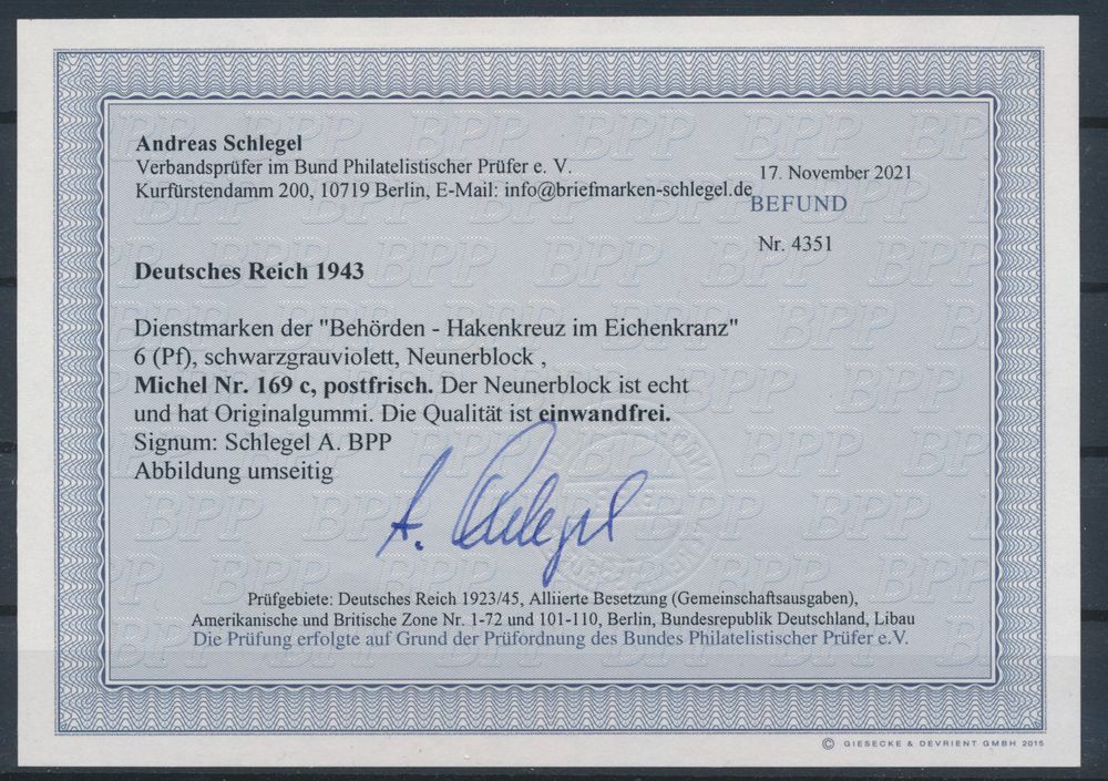 3571 nh imageN° 169c "1943 - 6pf. schwarzgrauviolett", souvenir sheet of 9, certificate A. Schlegel, all stamps with sign, vf (Mi. €765)(Image 1) (Image 2)