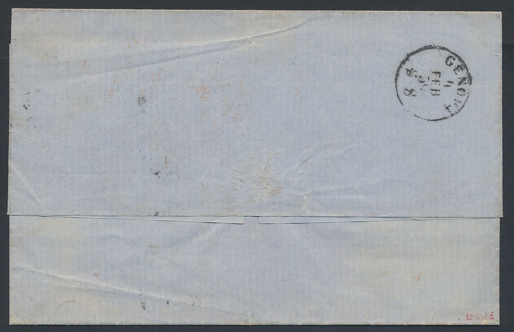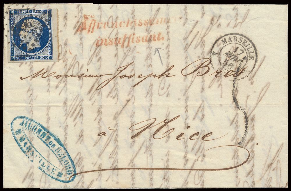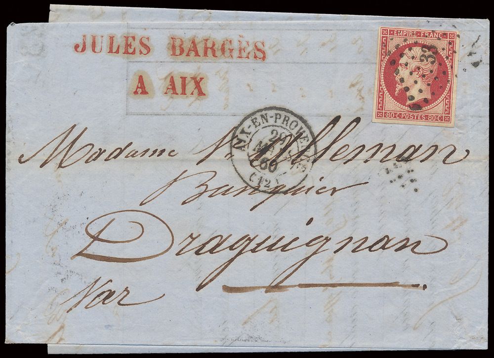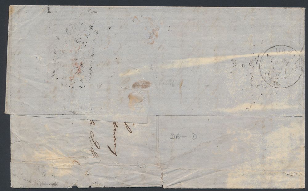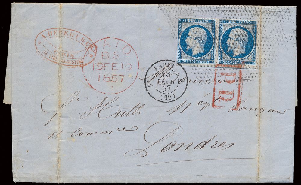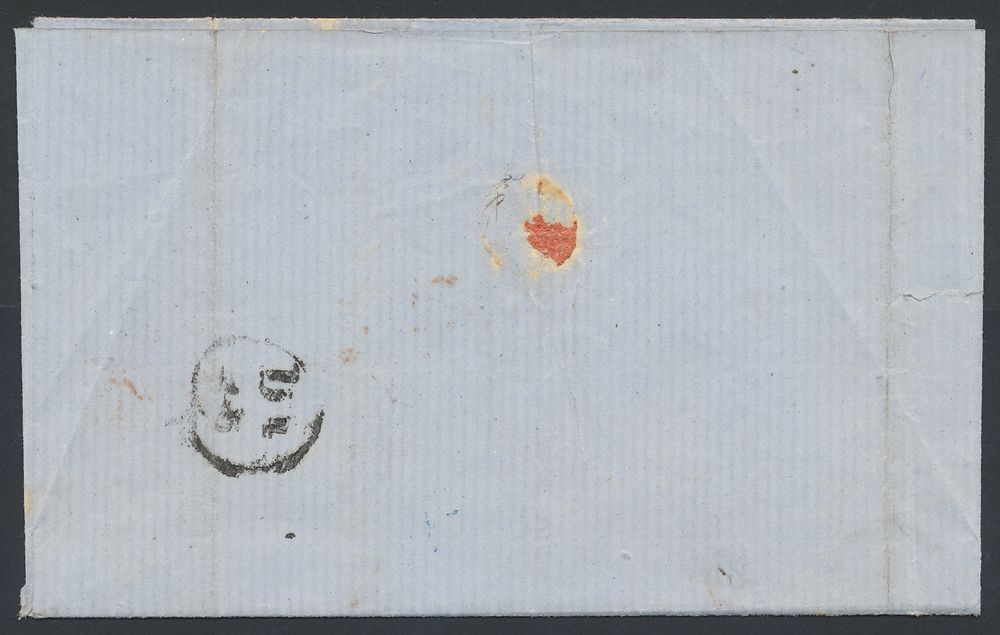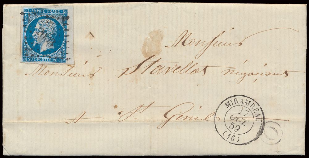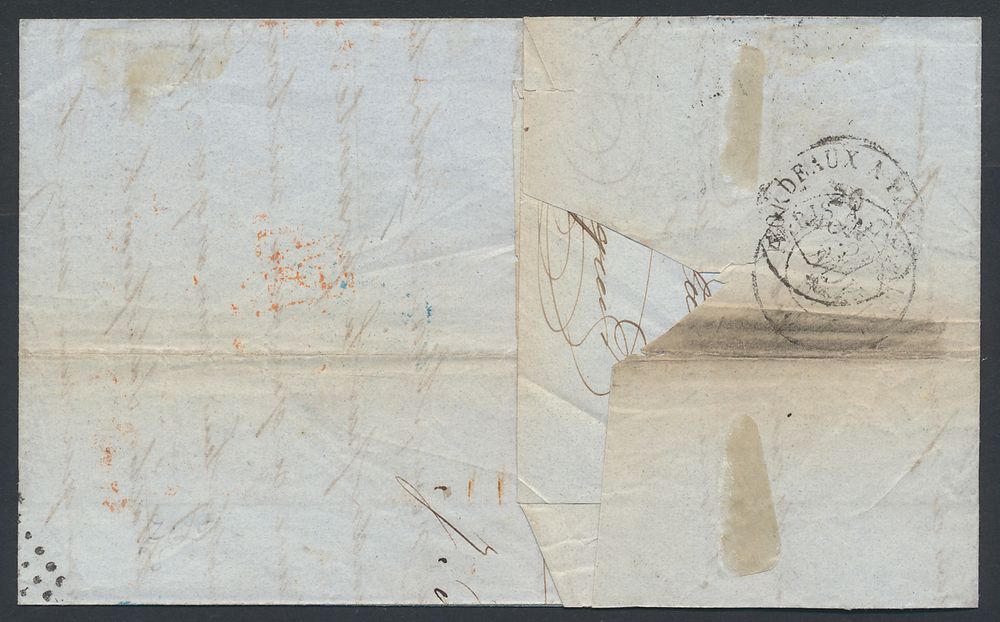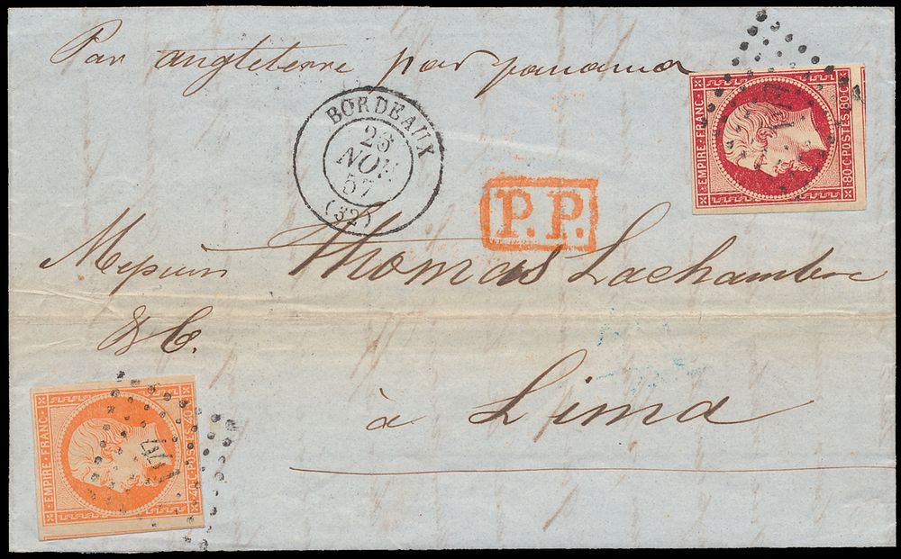 very well margined and cancelled P.C.-441 on letter from Bordeaux to Lima, Peru 26/11/1857 and thus correctly franked with 1fr.20c, very nice, vf/f (Maury €700)(Image 1)