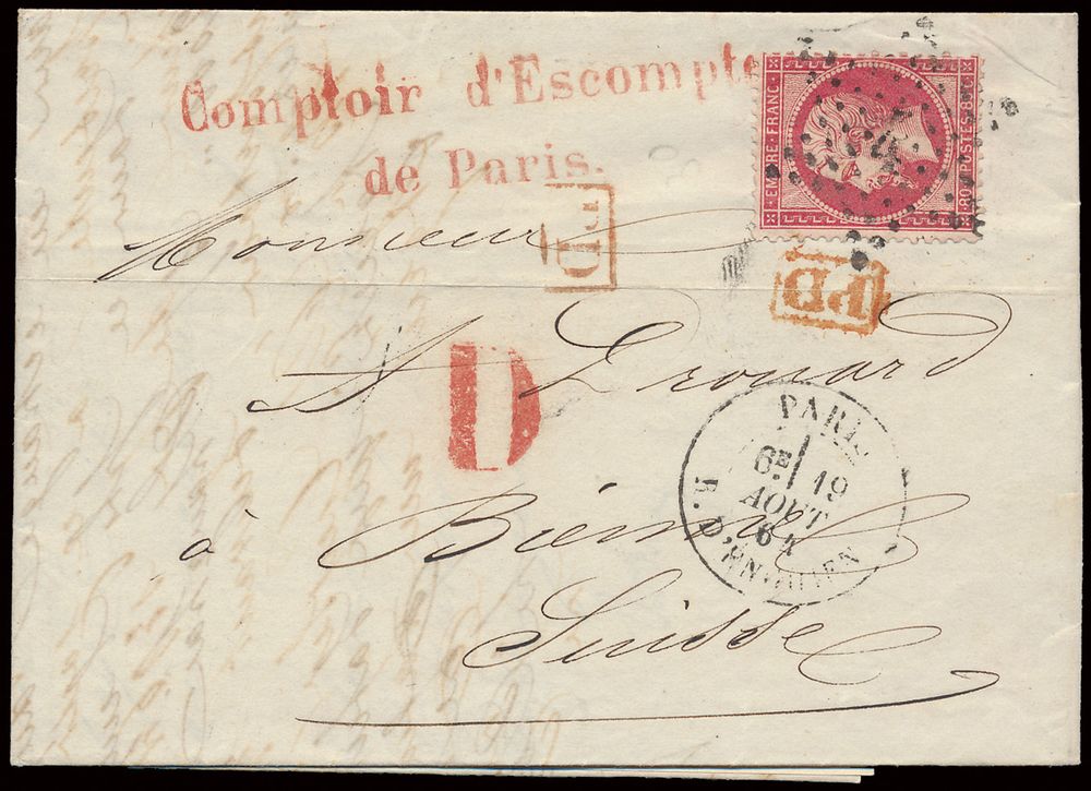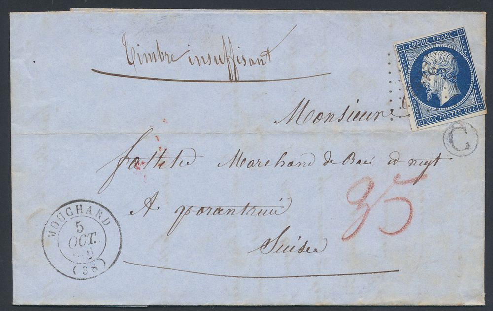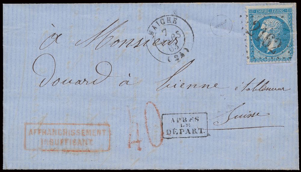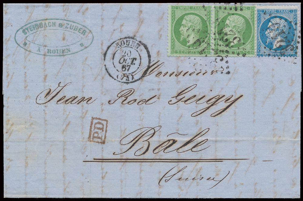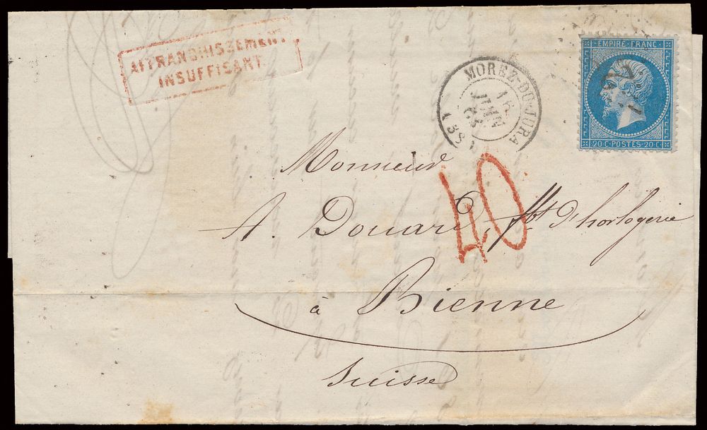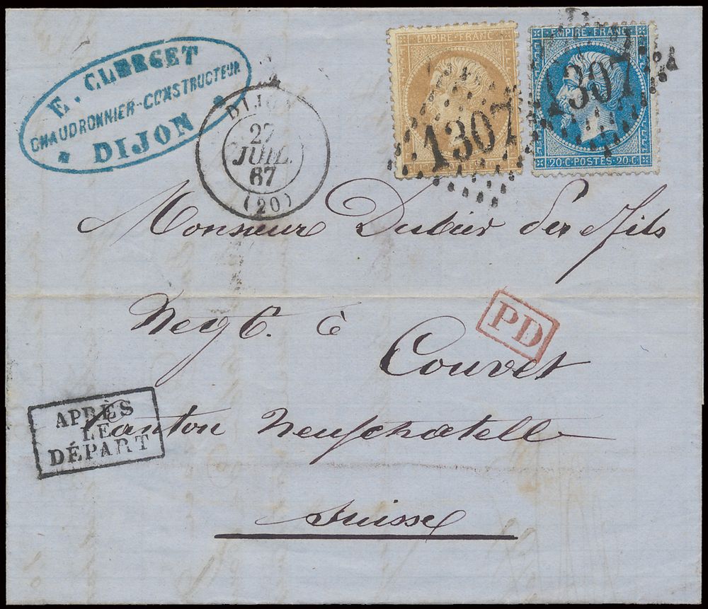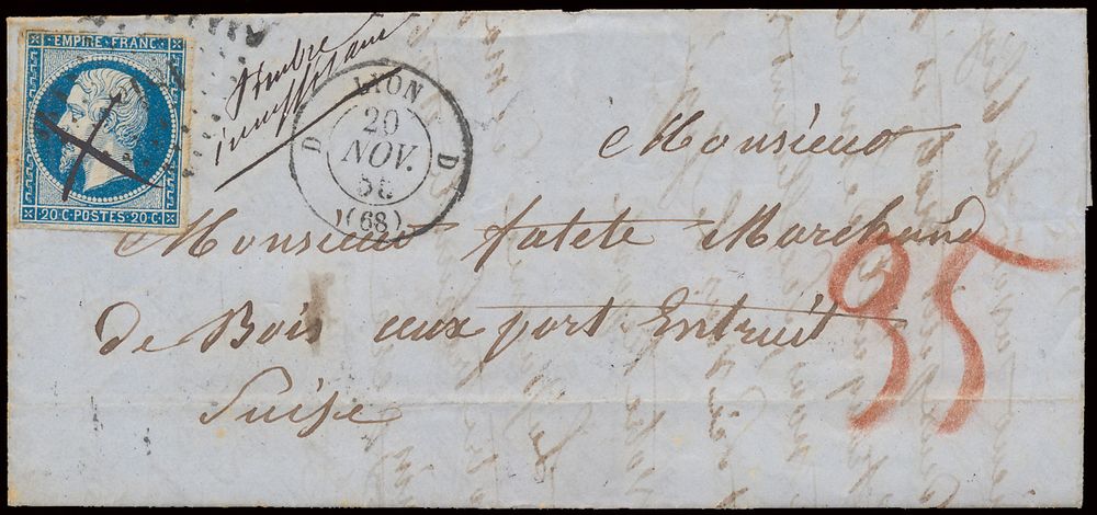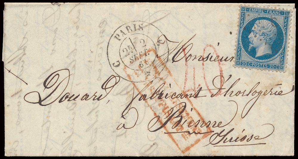 combination of Napoleon III perforated issue and sent to Switzerland (Bienne, Couvet and Bâle), vf(Image 1)
