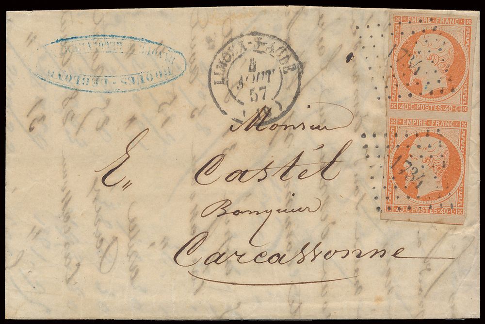 in pair, all cancelled P.C.-2706 on nice letter of third weight class from La Rochelle to New York 9/3/1859, correct charge of three times 80c. = 2fr.40c., letter is missing a large part of the back, but otherwise very nice, vf (Maury €600)(Image 1)