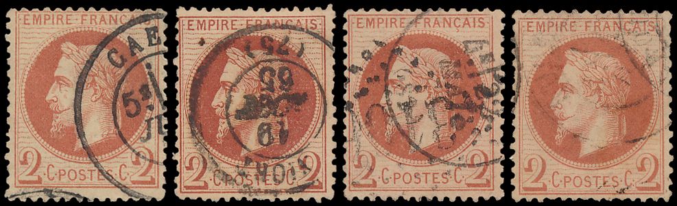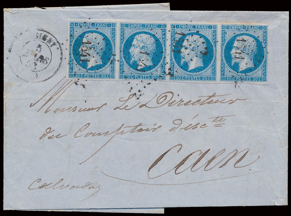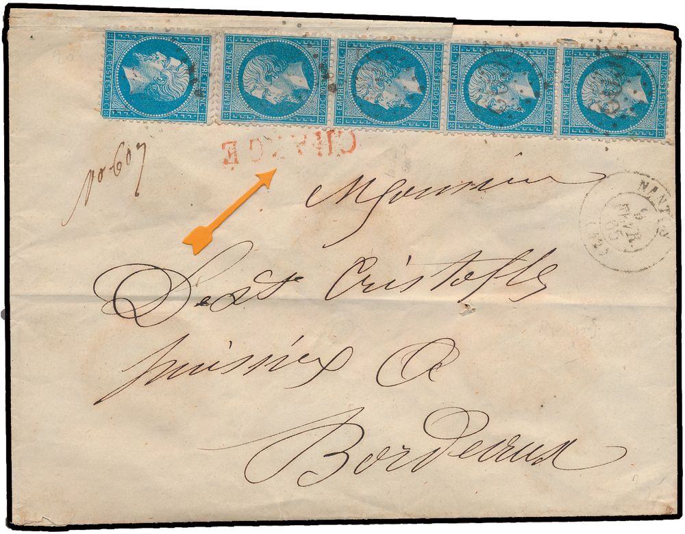 Napoleon III perforated issue, franking combination 1° letter: Yv. n° 22 + 23, 2° letter: Yv. 22 (3x) and 4° letter: Yv. n° 22 (5x) sent from Paris, Alger/Algeria, Caudebex and Nantes, all 4 inland, vf.(Image 1)