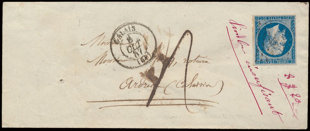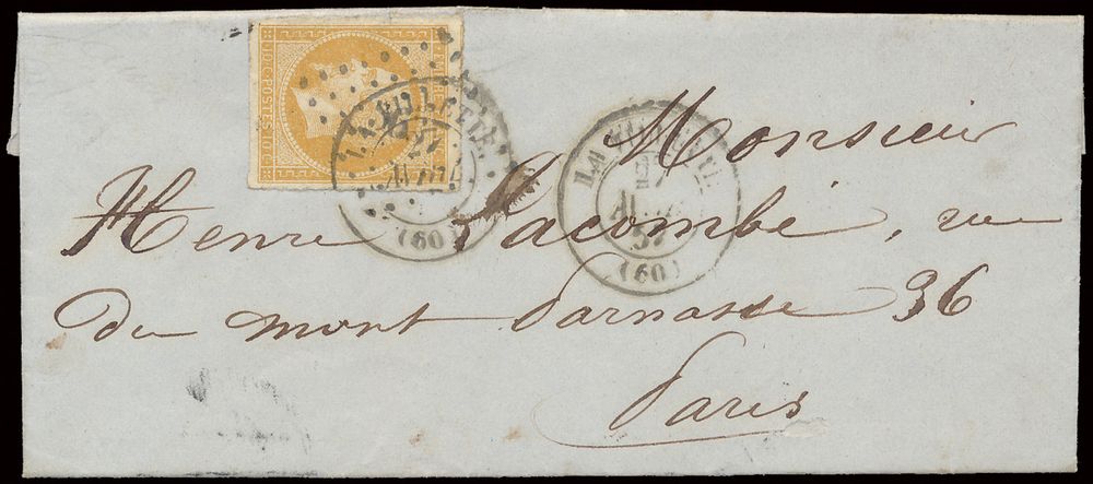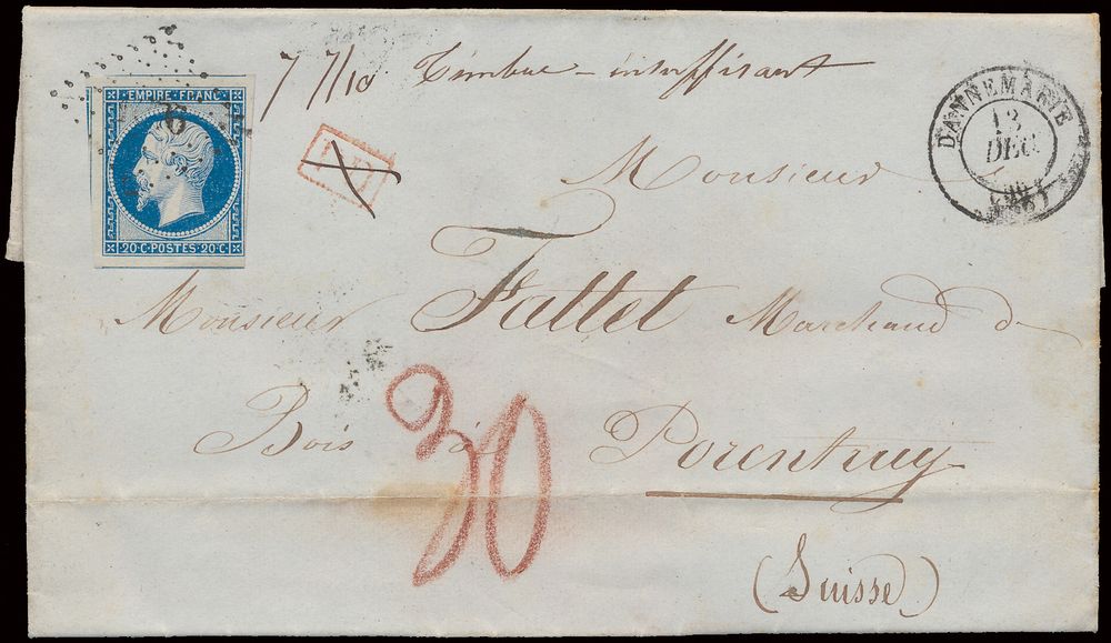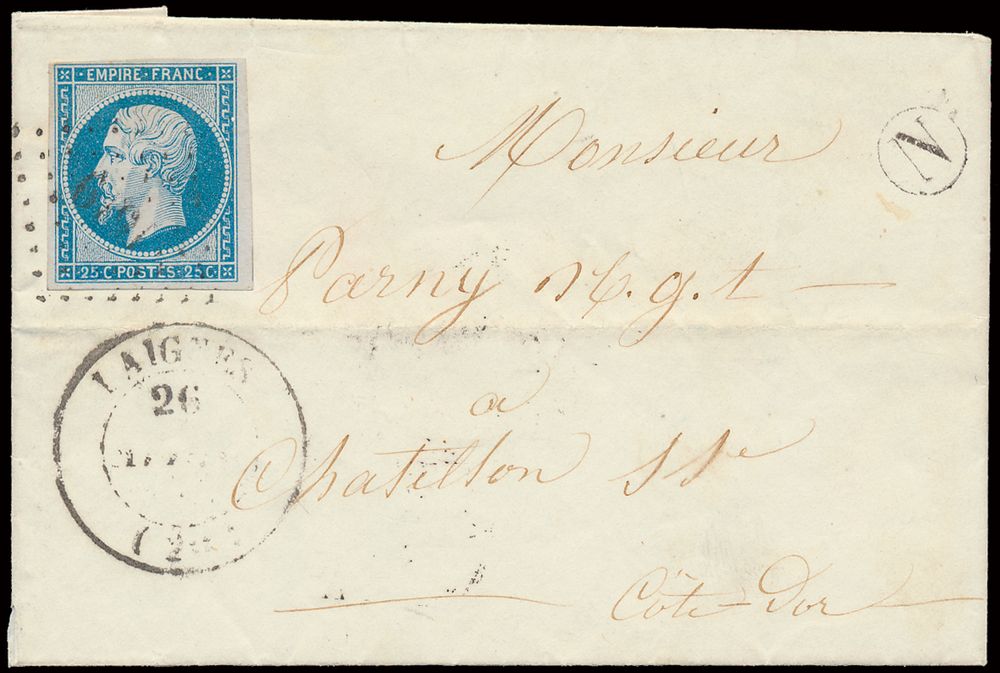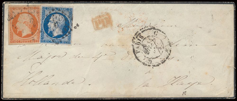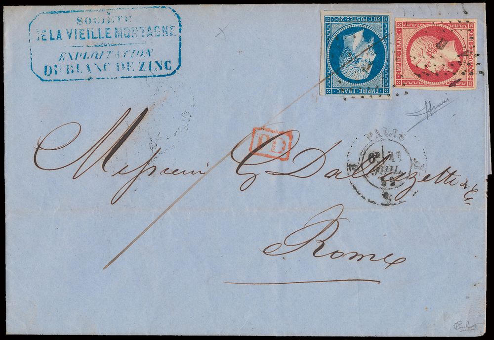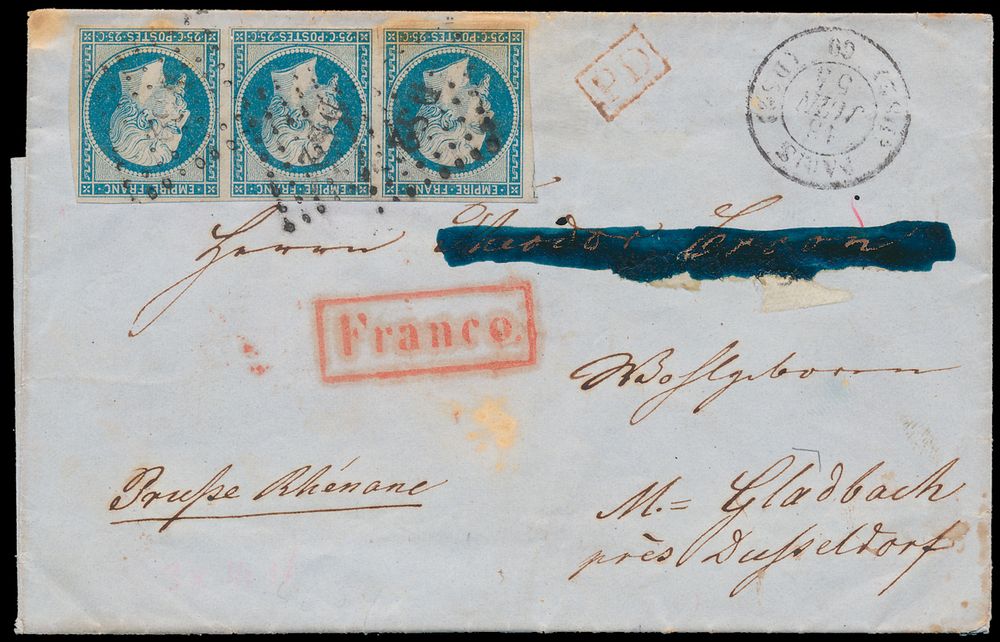 margins and with Parisian cancel "DS2-lettres Romaines" on letter from Paris to Munich Gladbach 13/6/1854, however, the correct franking was only 70c., very nice and rare letter, vf (Maury ++€2,700)(Image 1)