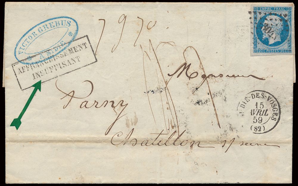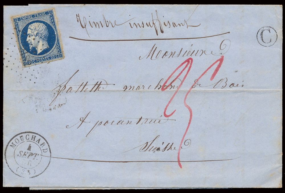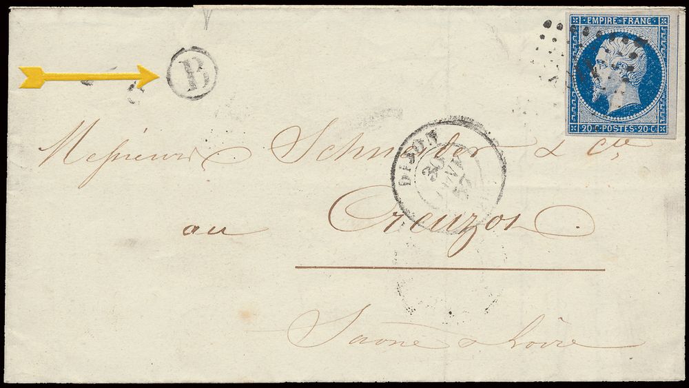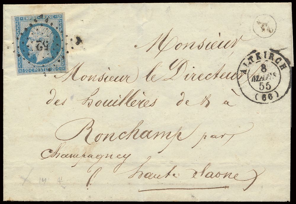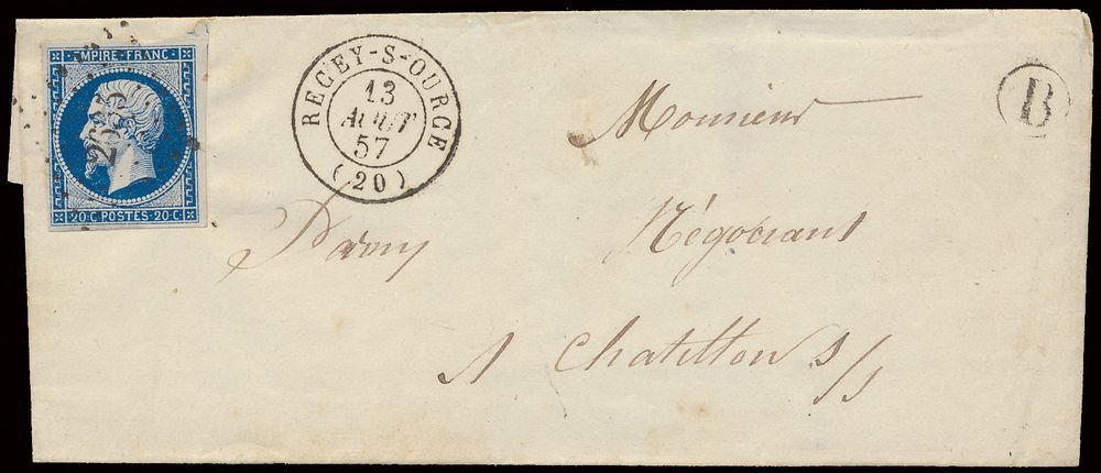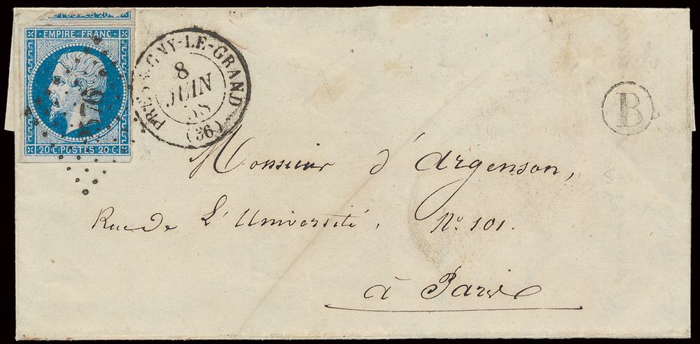 margins and with Parisian cancel "DS2-lettres Romaines" on letter from Paris to Munich Gladbach 13/6/1854, however, the correct franking was only 70c., very nice and rare letter, vf (Maury ++€2,700)(Image 1)