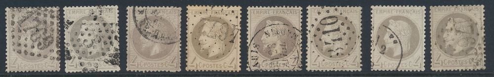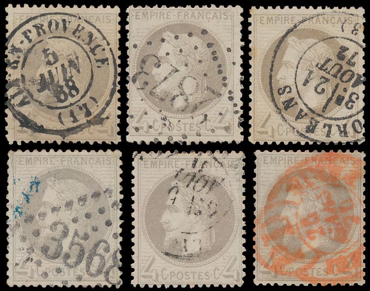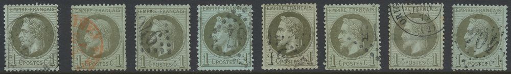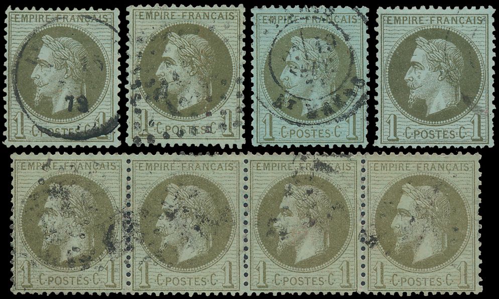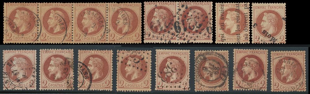 stamps involving various shades and cancellations, strip of 4 with light date stamp Gamaches, pair with G.C.-3219 and two stamps with typographical cancellation of newspapers, vf/f/to be checked (Yv. ++€1,095)(Image 1)
