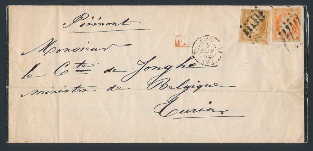 both full margins and cancelled with "Gros points" on obituary made Breuilpont 28/1/1855 and sent from Paris 6/2/1855 to Count De Jonghe, Belgian ambassador in Torino, interesting historical document, vf (Yv. ++€325)(Image 1)