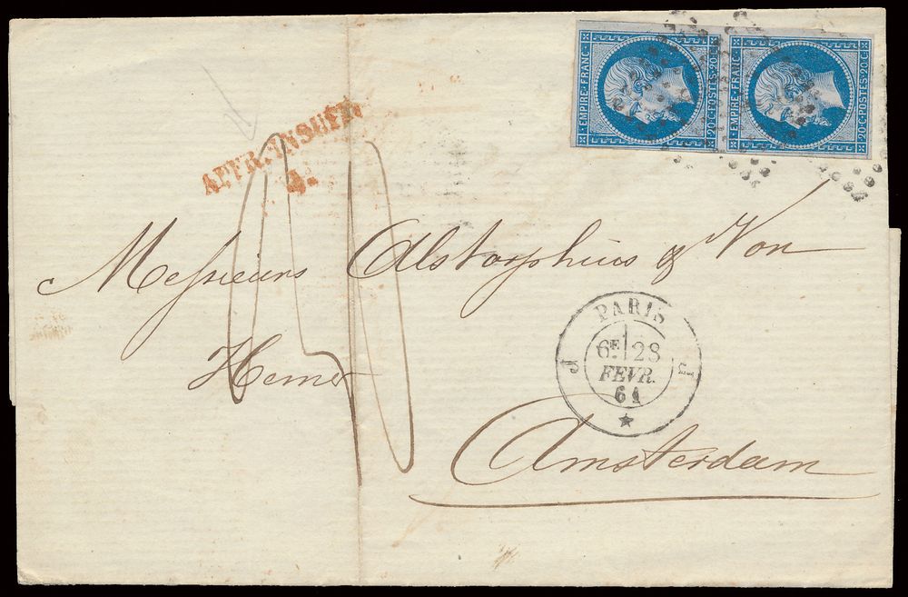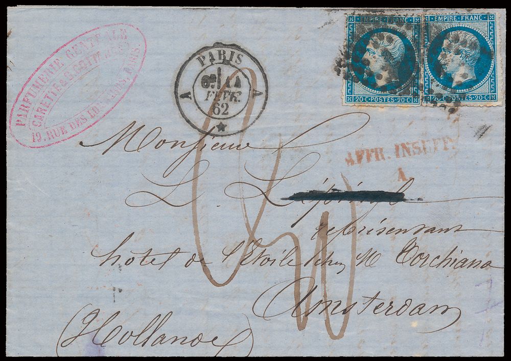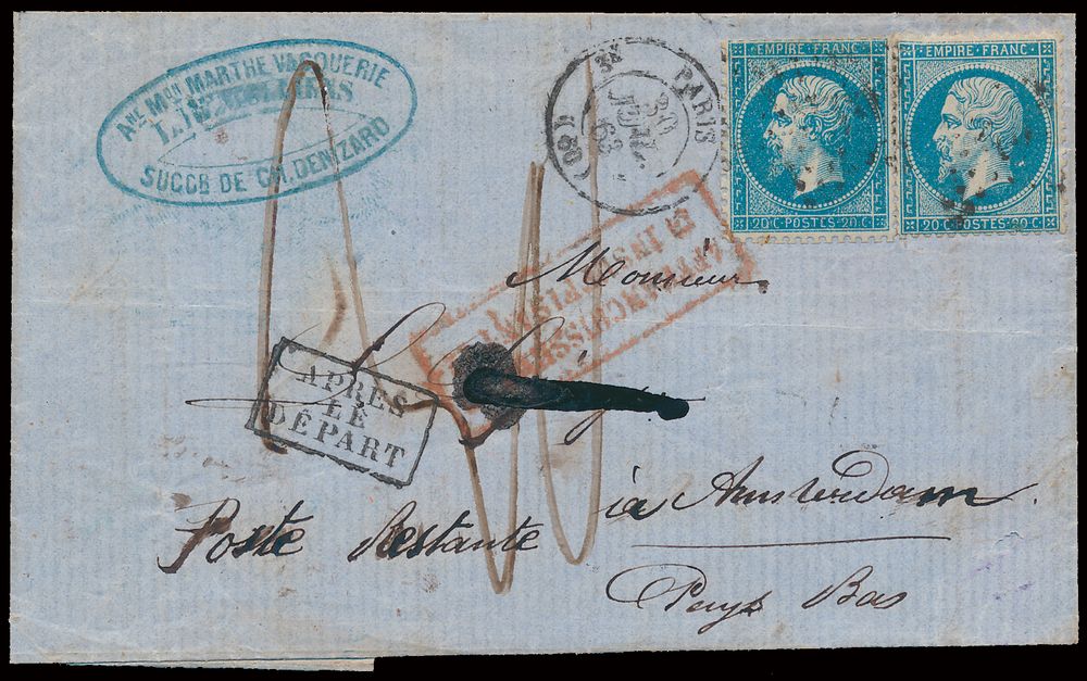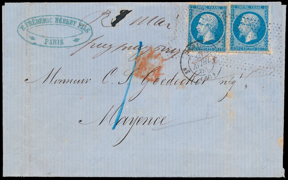 imperforated together on letter with rare pointillés cancel, from Paris to Mainz, Germany, 30/4/1863, rare combination, vf(Image 1)