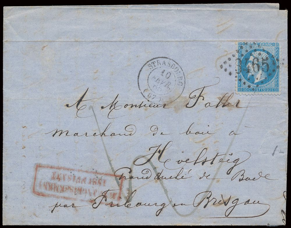Yv. n° 22 "20c. blue" and with "AFFRANCHISEMENT INSUFFISANT" cancellation, sent to the Netherlands (1x), Switzerland (3x) and Freiburg (1x), vf/f(Image 1)
