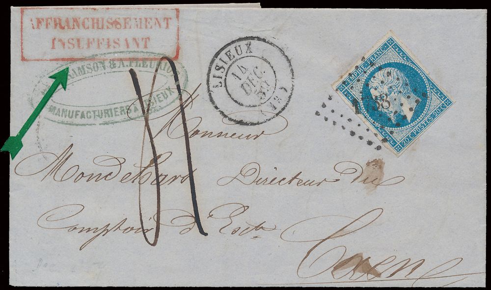 INSUFFISANT" or "TAXE", letters franked with Yv. n° 14A or 14B "20c. blue", many different types or cancellations and also destination to Switzerland, Netherlands and France, vf(Image 1)
