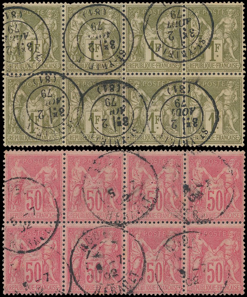 3713 0 imageN° 74 and 104 "1fr. bronze" Type I in block of 8, nice centring, cancelled "ST. YRIEIX-1879" and "50c. pink" Type I in souvenir sheet of 8 cancelled with c.à.d., vf (Yv. ++€920)(Image 1) (All Images)