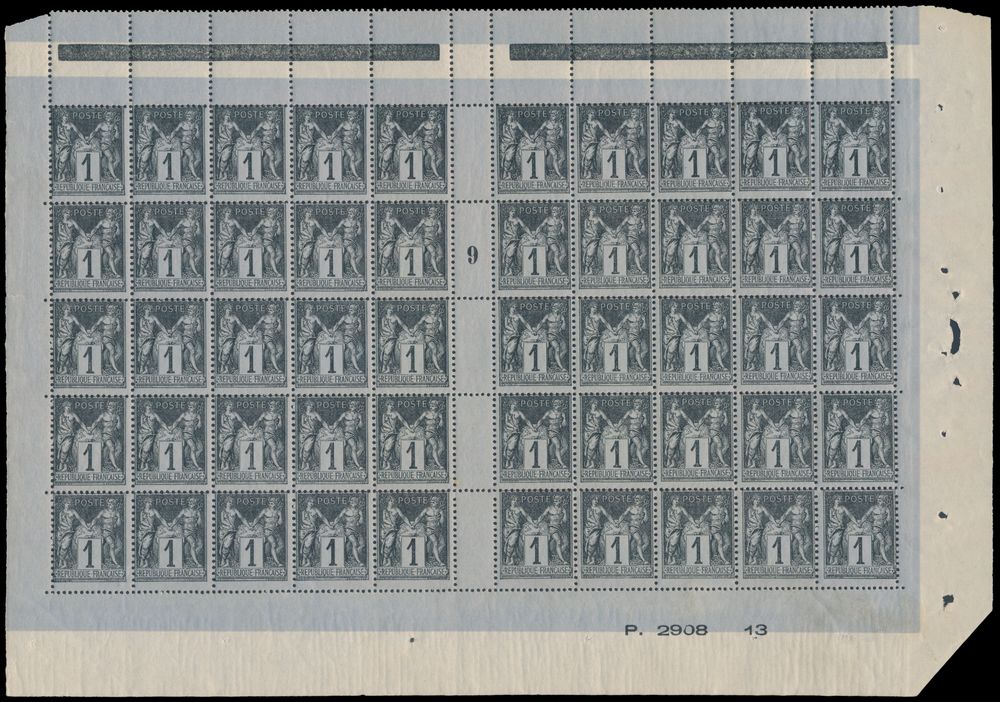 3720 nh imageN° 83 (50x) Sage Type II "1c. noir sur azuré" in sheetlet of 50 stamps and with millésime 9, tiny rust spot on intermediate panel, vf (Yv. ++€611)(Image 1) (All Images)