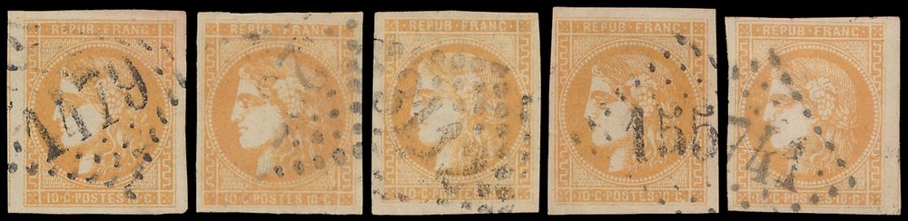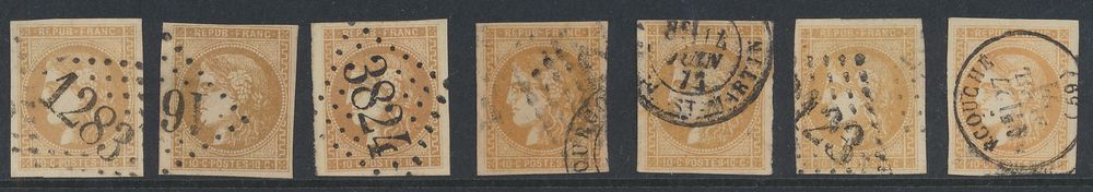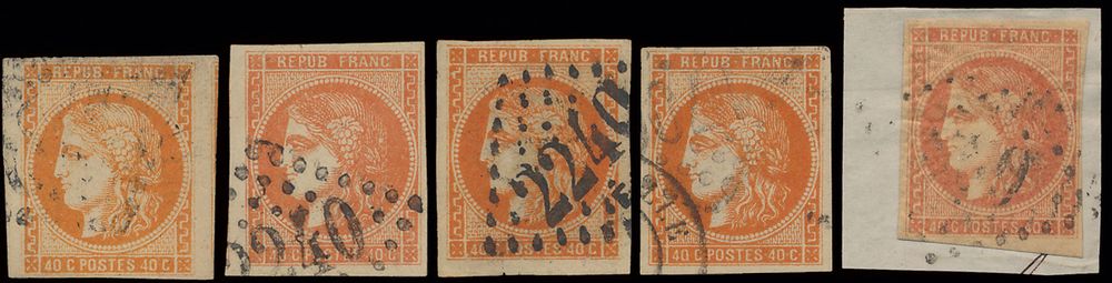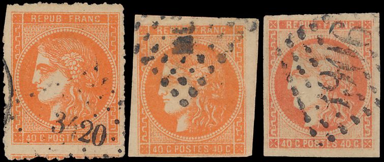 3702 0 imageN° 48 "40c. orange", accumulation of 8 stamps broadly margined with various cancels wo. G.C.-2240, G.C.-3906, ambulantory stamp Marseille-Lyon P.C.-3420 (also with private perforation "percé en lignes), vf/f (Yv. €1,430)(Image 1) (Image 2)