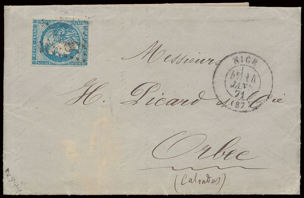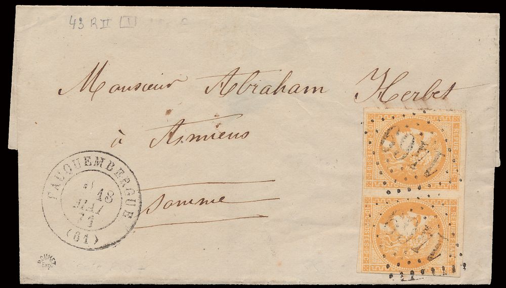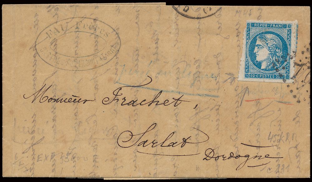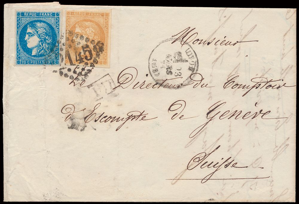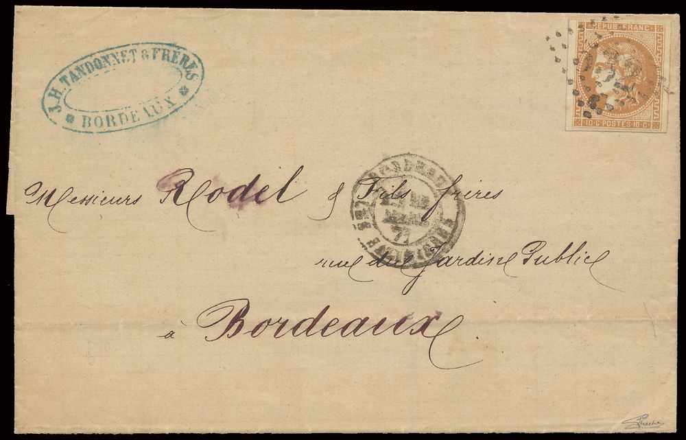 3706 image1871 Accumulation of 6 letters franked with various combination with Cérès from Bordeaux issue wo. stamps with private perf on n° 45C, one letter to Switzerland, one letter with n° 43Ba (horizontal pair) from G.C.-1469 Fauquembergue to Amiens, vf/f (Yv. €1,295 + Maury €650)(Image 1) (Image 2) (Image 3) (Image 4) (Image 5) (Image 6)