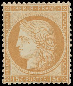 3708 og imageN° 55 Third Republic "15c. bister" unused with original gum and with nice plate error 'colour dot under the eye of Cérès', very fresh and very nice ex., vf (Yv. €700)(Image 1) (All Images)