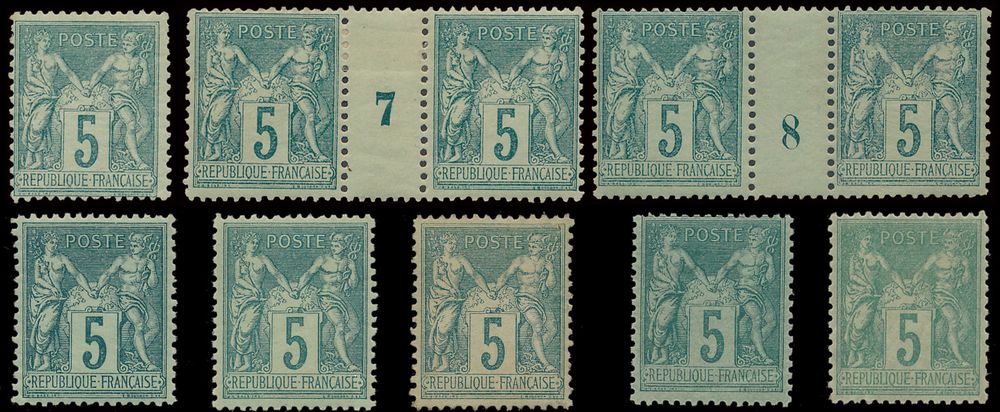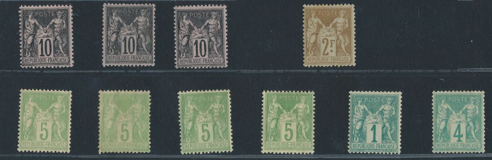 3710 nh/og imageN° 61, 63, 102 (4x), 103 (3x), 103b (pair), 105 and 106a (pair) Accumulation of 14 stamps type sage wo. type I and type II together in pair 103b and 106a, also various shades oa. n° 102, vf/f (Yv. €1,872)(Image 1) (Image 2)
