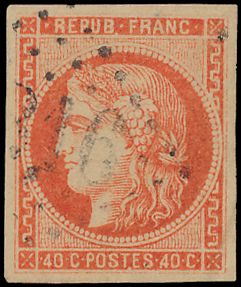 3703 0 imageN° 48d "40c. blood red" with cancel G.C., broadly margined and with expert mark Roumet, rare shade and very nice, light crease lower right, vf/f (Yv. €1,000)(Image 1) (All Images)