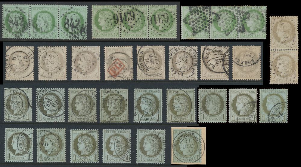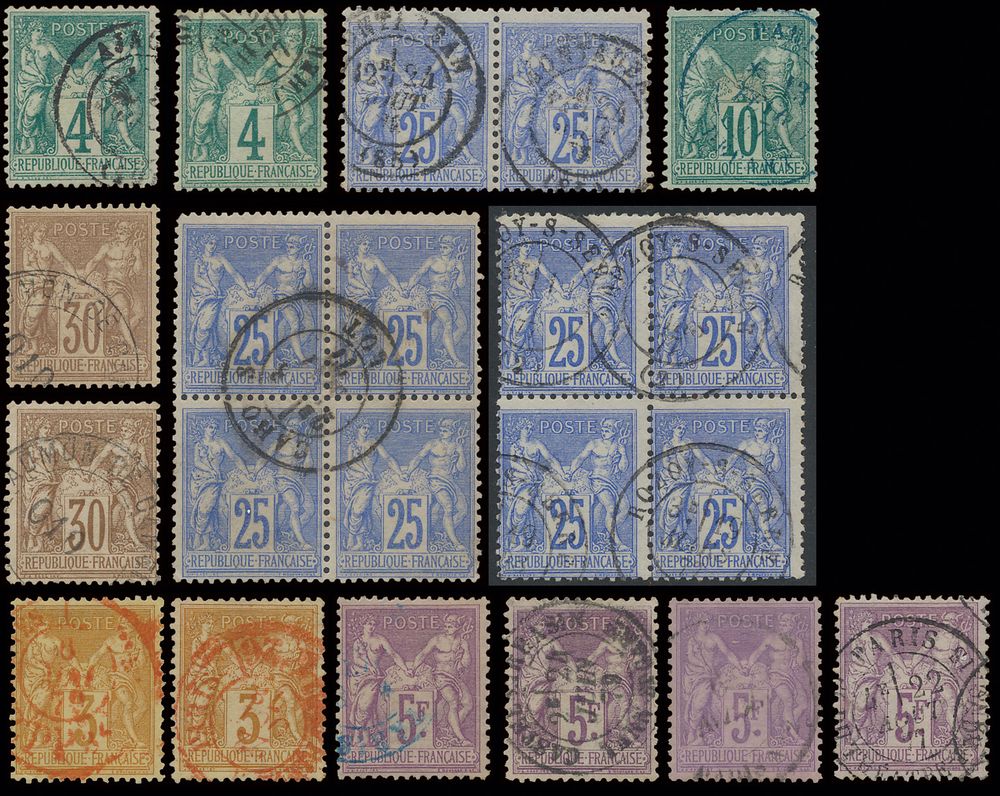 3711 0 imageN° 61, 62, 63, 68, 69, 76, 78, 86 and 95 Accumulation of 24 stamps cancelled wo. 2 blocks of four of n° 78, n° 95 (4x) with various shades and cancellations, n° 62 (2x), n° 76 with blue c.à.d. of Paris, vf/f/to be checked (Yv. €2485)(Image 1) (Image 2)