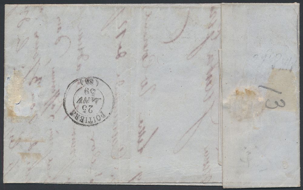3804 image1859 T1 Taxe "10c. black" with lithographic printing on very nice letter from Poitiers, sent locally 25.1.1859, rare and very nice, vf (Yv. €850)(Image 1) (Image 2)