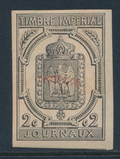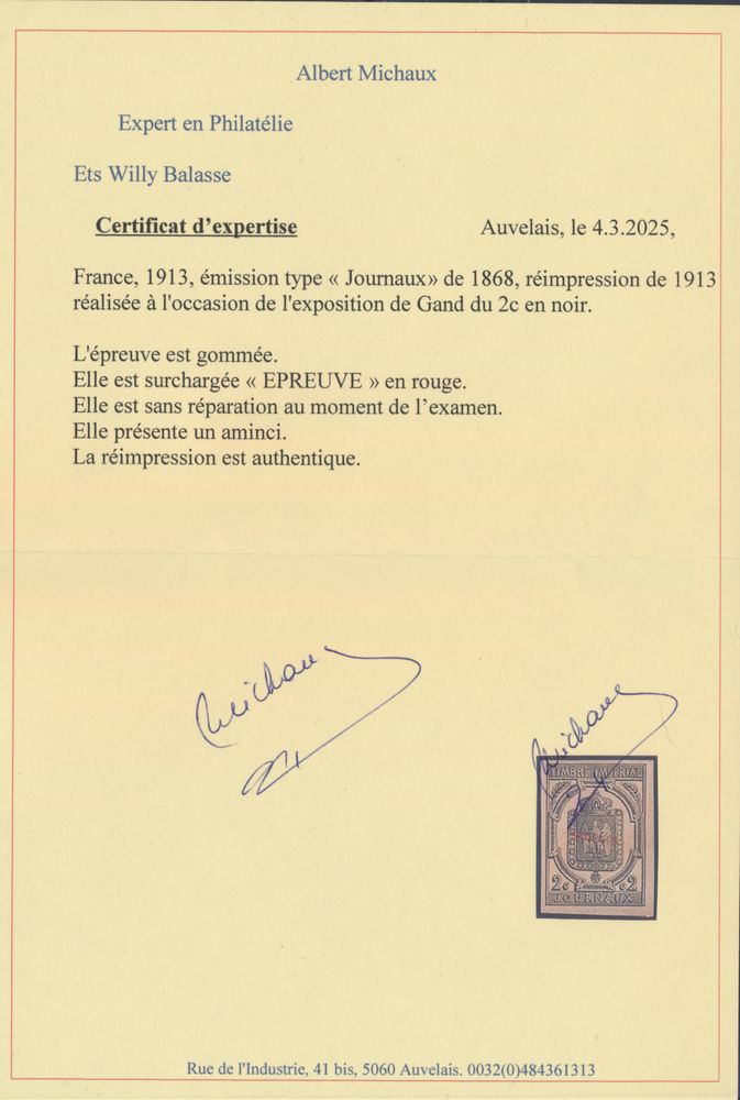 3805 og imageReprint of type 1868 'Journaux 1913 2c in black' on occasion of Expo in Ghent, overprint Epreuve (in red), thinned, toned gum, with photo certificate, f/to be checked.(Image 1) (Image 2)