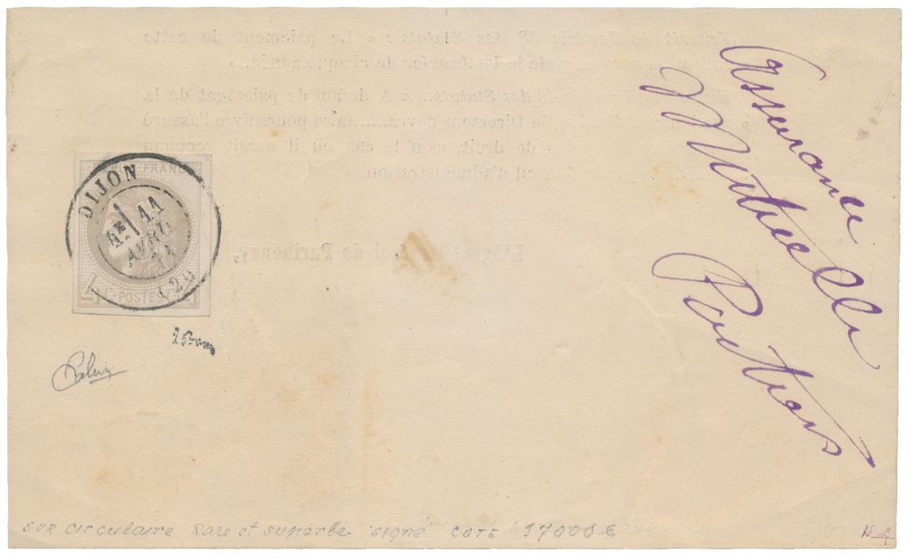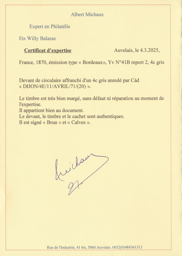 3854 image1871, N° 41 B 'Report 2, 1870, 4c grey' on front of circular, LUXURY stamp with cancellation Dijon 1871 (expertised Brun and Calves), with photo certificate, VERY RARE, (Yv € as single franking €20,000)(Image 1) (Image 2) (Image 3)
