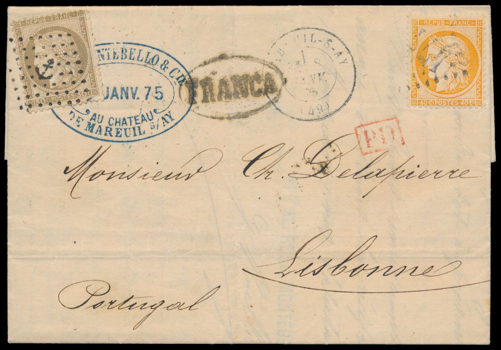 3855 image1875, letter from Mareuil s/ Ay to Lisbon, franked Yv N° 38 and 56 (cancelled with cancellation anchor), vf.(Image 1) (Image 2)