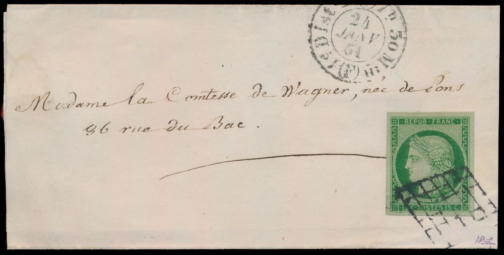 3852 image1851, front and back of lovely ladies' note with superb Cérès 15c green, signed front, vf (Yv vd stamp €1,850)(Image 1) (Image 2)