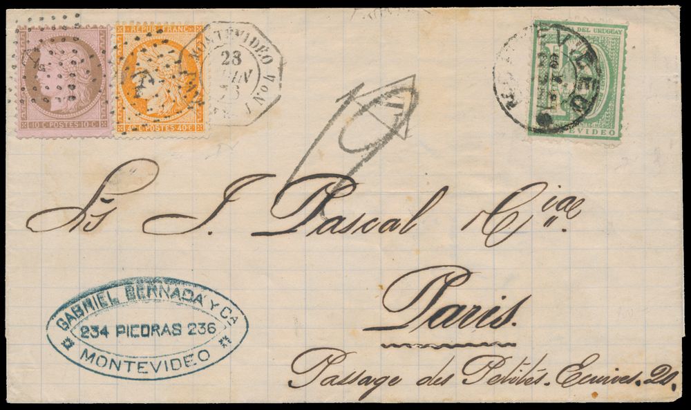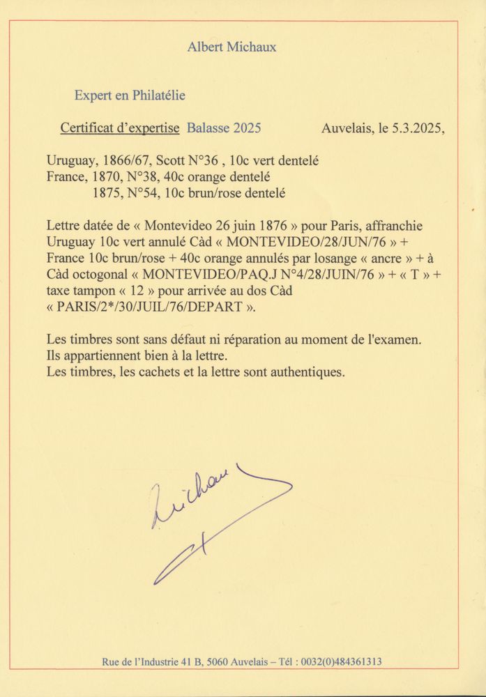 3857 image1876, nice letter from Montevideo to Paris, franked Uruguay 10c green and France Yv 38 and 54' with cancellations 'Anchor' and Montevideo, with photo certificate, vf.(Image 1) (Image 2) (Image 3)