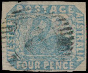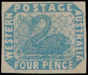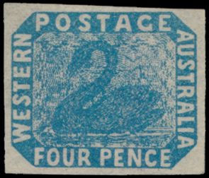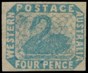 3981 0 imageWestern Australia, n° 3c "1854 - four pence slate-blue", four-edge, vf (£1,300)(Image 1) (All Images)