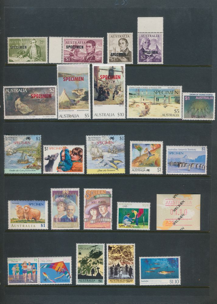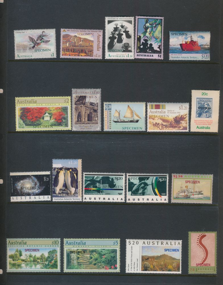 3970 nh image1966/1991, complete collection of "Specimen overprints" including the better type overprint on Navigator 75c (15mm), rare UPU dove 1974, Kookaburra 1978 without gum (not issued with gum), various extras in blocks of four, rarely offered complete, vf, high vf.(Image 1) (Image 2)
