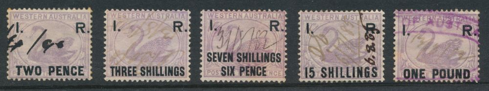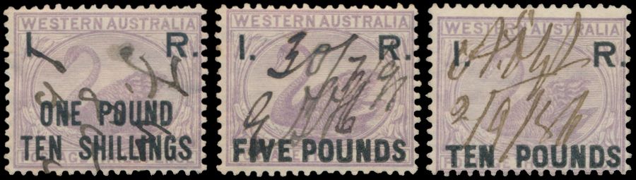 3996 0 imageWestern Australia, 1882 Internal Revenues surcharges, accumulation of "2p.", "3/-", "7/6", "15/-", "£1", "£1 ten shillings", "£5", "£10", scarce, vf (Barefoot £308)(Image 1) (Image 2)