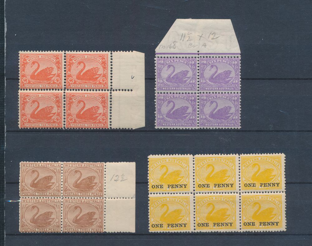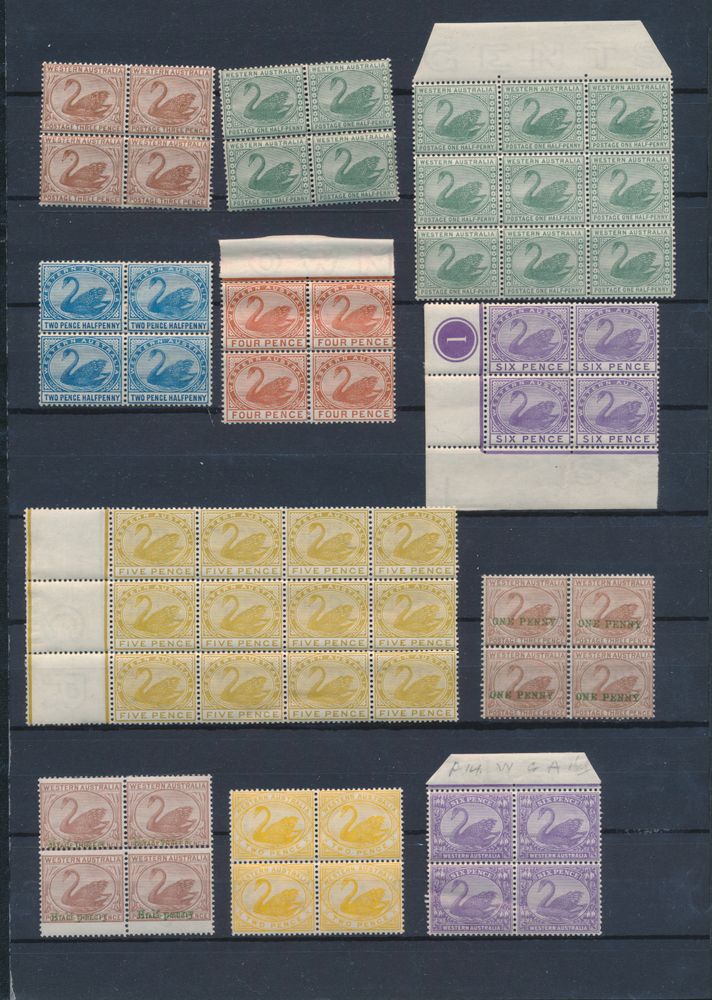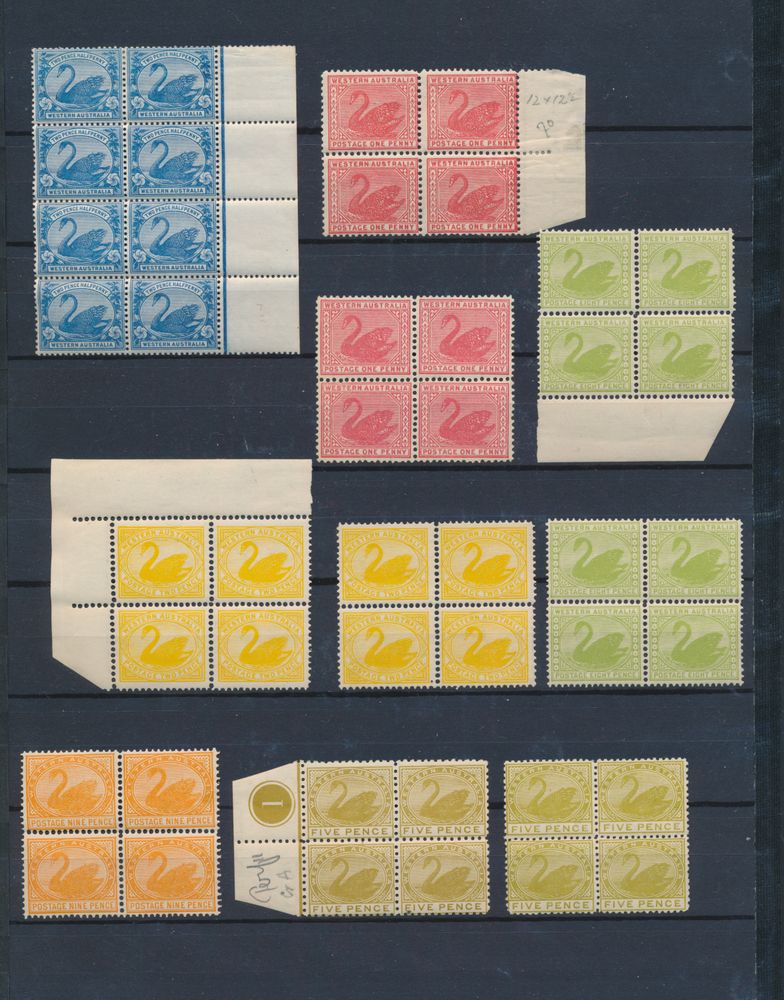 3997 nh/og imageWestern Australia, 1882/1912, nice accumulation blocks of four and some larger units, some gum folds, but mint nice quality, most stamps mint, vf/f (S.G. £2,750)(Image 1) (Image 2) (Image 3)