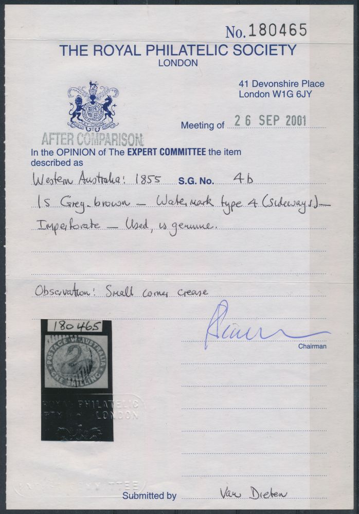 3986 0 imageWestern Australia, n° 4b "1855 - one shilling grey-brown", beautiful stamp with almost invisible corner crease, certificate R.P.S., vf (S.G. £400)(Image 1) (Image 2)