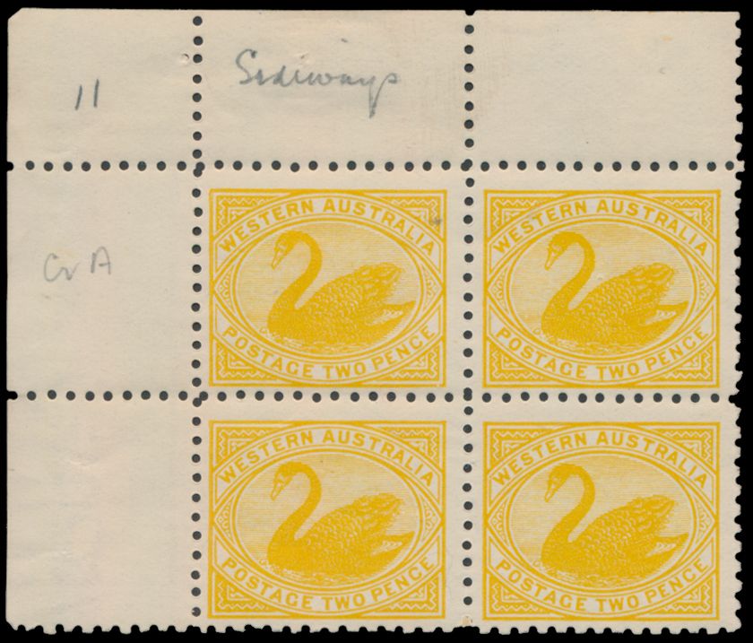 3995 nh imageWestern Australia, n° 130 "1902 - two pence yellow watermark V over brown P11", corner block of 4, stamp very nice mint, hinge residue in margins, very rare, vf (S.G. ++£1,700)(Image 1) (All Images)