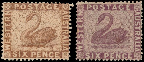 3992 og imageWestern Australia, n° 42 (2x) "1861 - six pence purple-brown", 2 shades, vf (S.G. £1,100)(Image 1) (All Images)