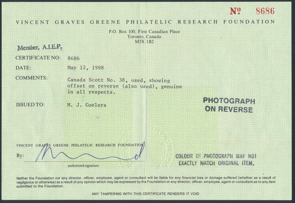 4020 0 imageN° 38 '1877', 1c yellow with offset on back both sides cancelled, interesting and very unusual, certificate GPRF with extra letter, vm. - see photo cover(Image 1) (Image 2) (Image 3)