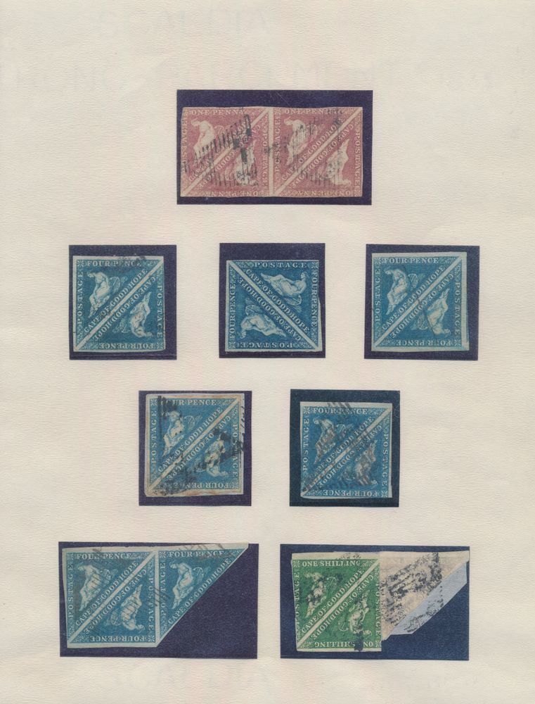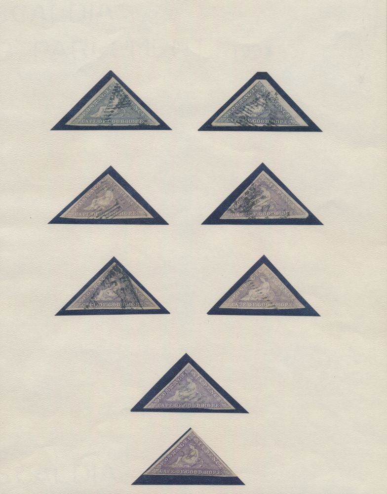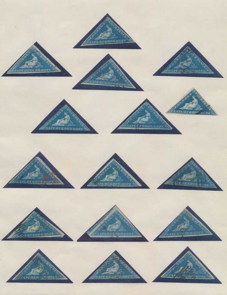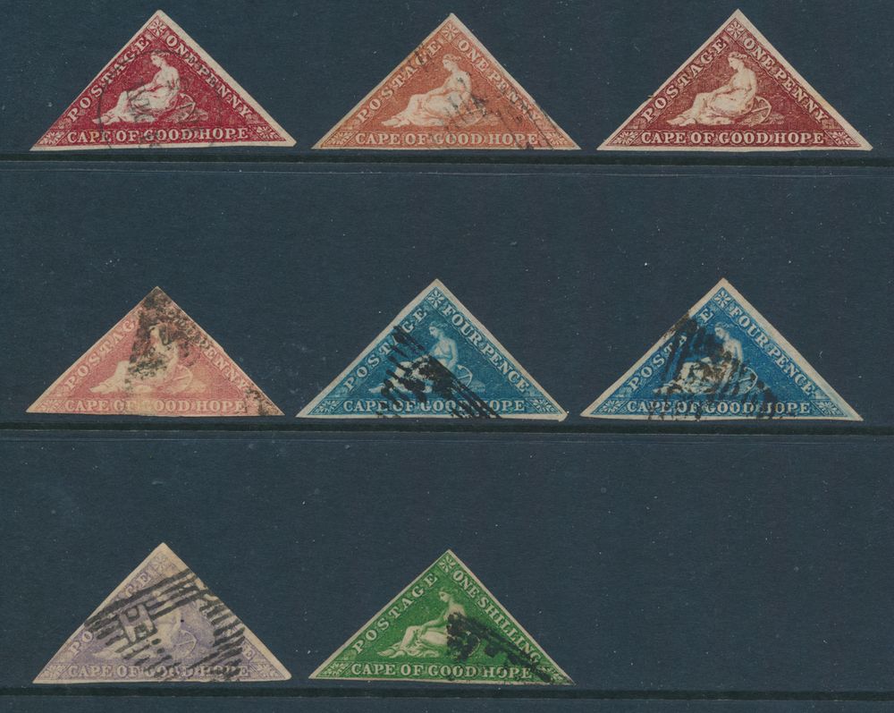 4038 ng/0 image1855/1864 Beautiful accumulation of Cape triangles with various shades of 1d. (4 items, including one item uncancelled), "2d." (2x), "6d." and "1sh." (very nice colour), vf/f(Image 1) (All Images)