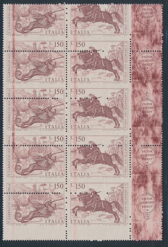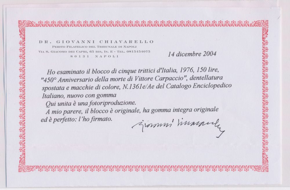 4234 nh imageN° 1340/41 'V. Carpaccio' triptych in souvenir sheet of 5-Cu shifted perfs and various colour smudges (printing waste), spectacular with photo certificate, Chiavarello, vf (Yv. n°1269/70)(Image 1) (Image 2)