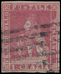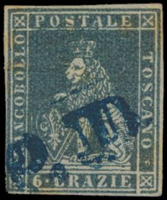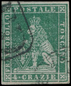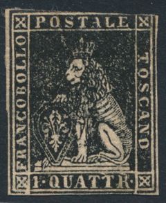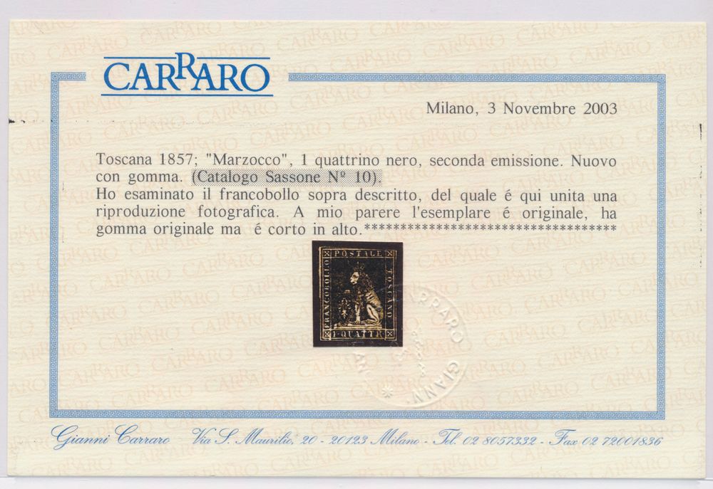 4227 og imageN° 10 'Marzocco 1 quattr. black' with original gum, incised at top with photo certificate Carraro (Yv. n° 10), f (Sass. €3,200)(Image 1) (Image 2)