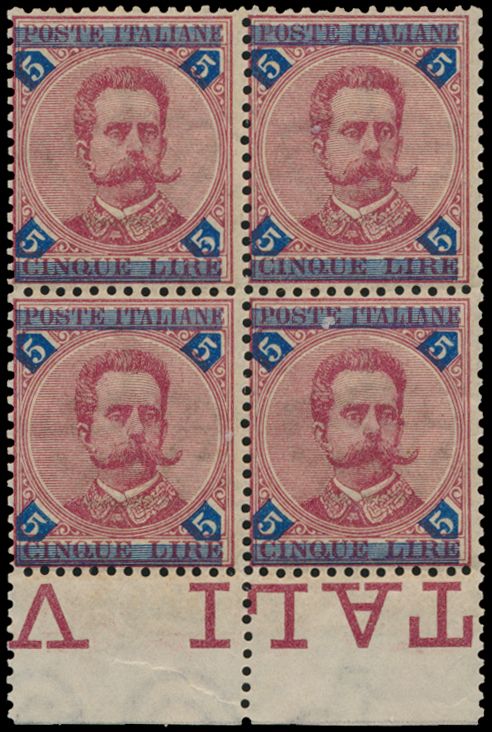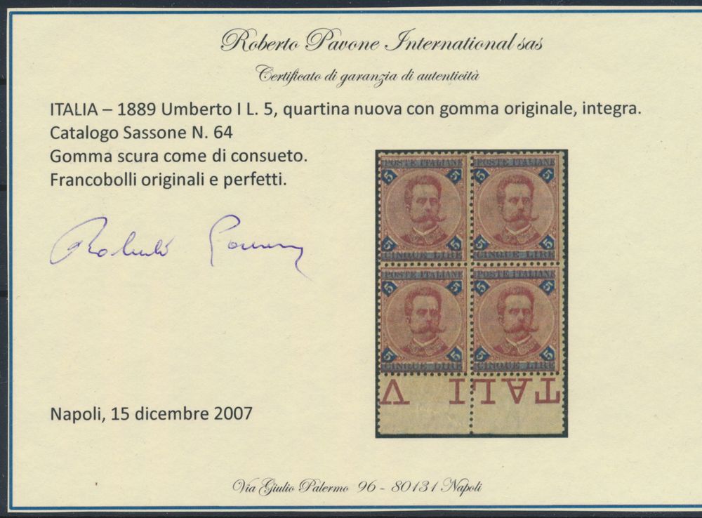 4231 nh imageN° 64 "1889 - Umberto I 5l.", mint block of four with extended lower margin, tinted gum as always, certificate Pavone, vf (Sass. +€1,375)(Image 1) (Image 2)