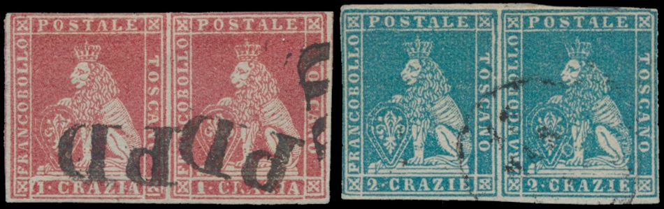4223 0 imageN° 4 and 5 "1851 - 1cr. and 2cr.", both in horizontal pair with expert marks, n° 4 with corner crease, vf/f (Sass. ++€1,050)(Image 1) (All Images)