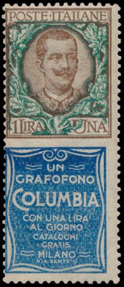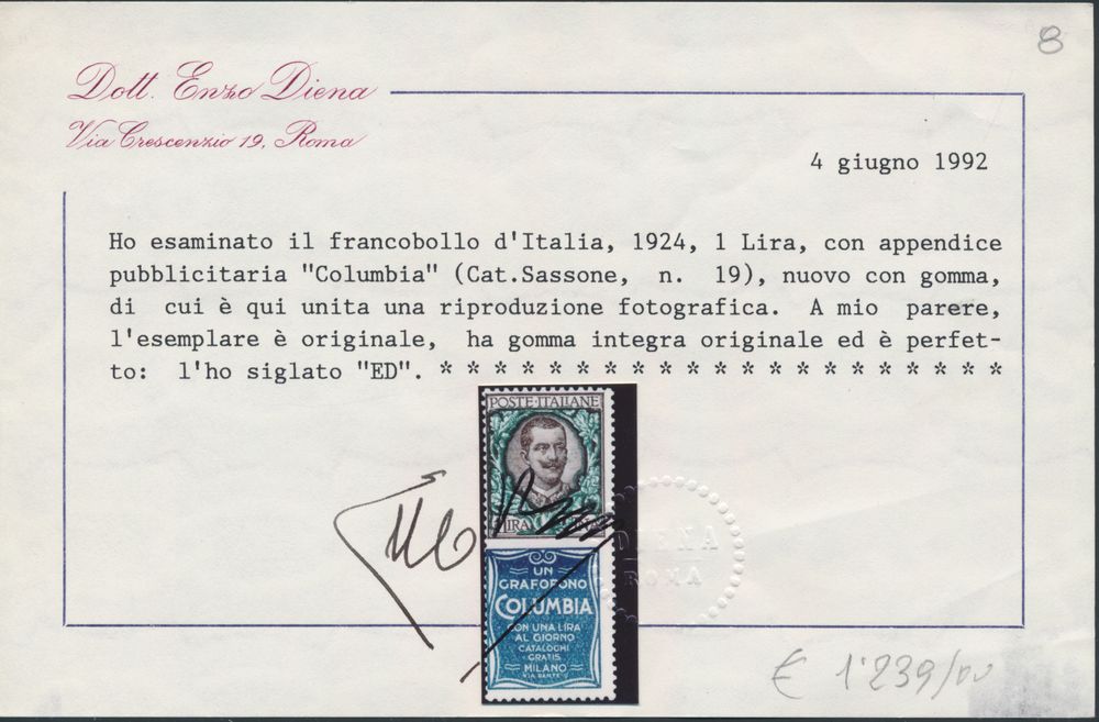 4236 nh image1924 Pubblicitari "1 lira brown and green" with tab "Columbia", certificate E. Diena, rare! (Sass. €2,800) - see photo cover(Image 1) (Image 2)
