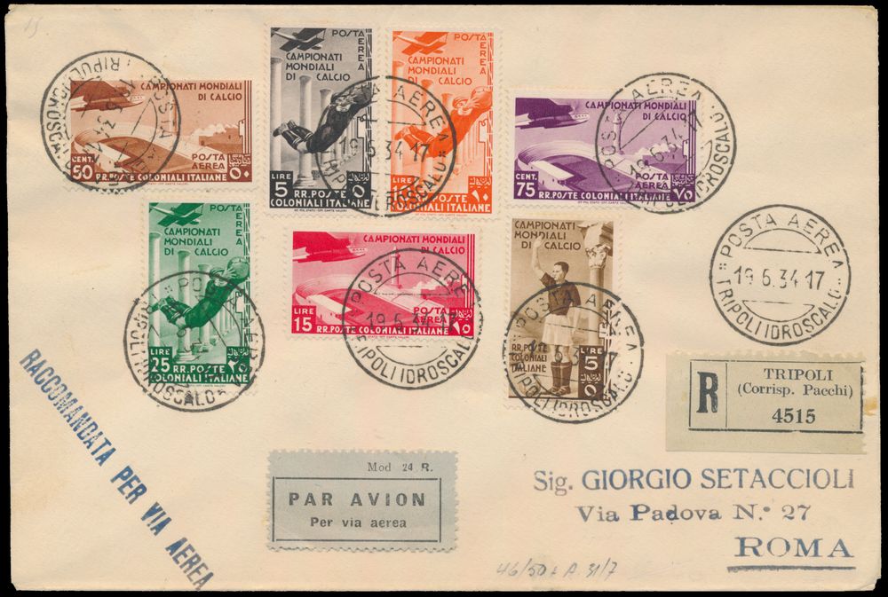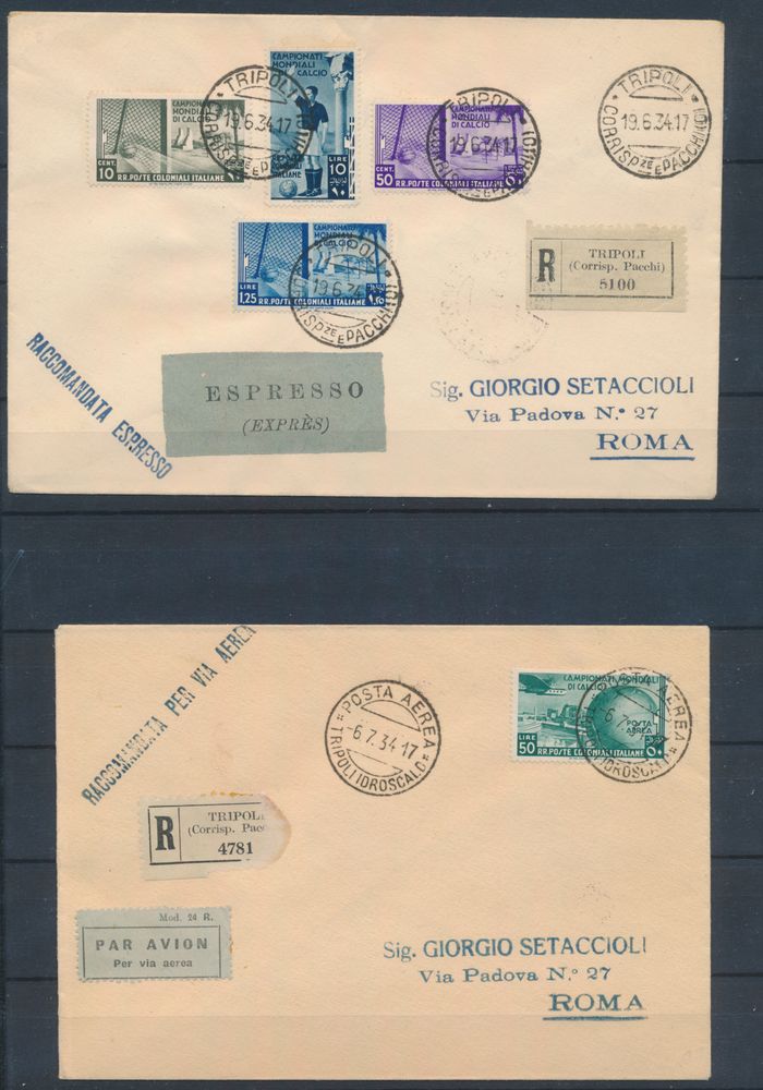 4250 image1934, N° 46/50 and A 31/37 'World Cup' full set on 3 registered letters from Tripoli to Roma (Sass €3,500, stamp value €2,800)- VERY RARE, vf.(Image 1) (Image 2)