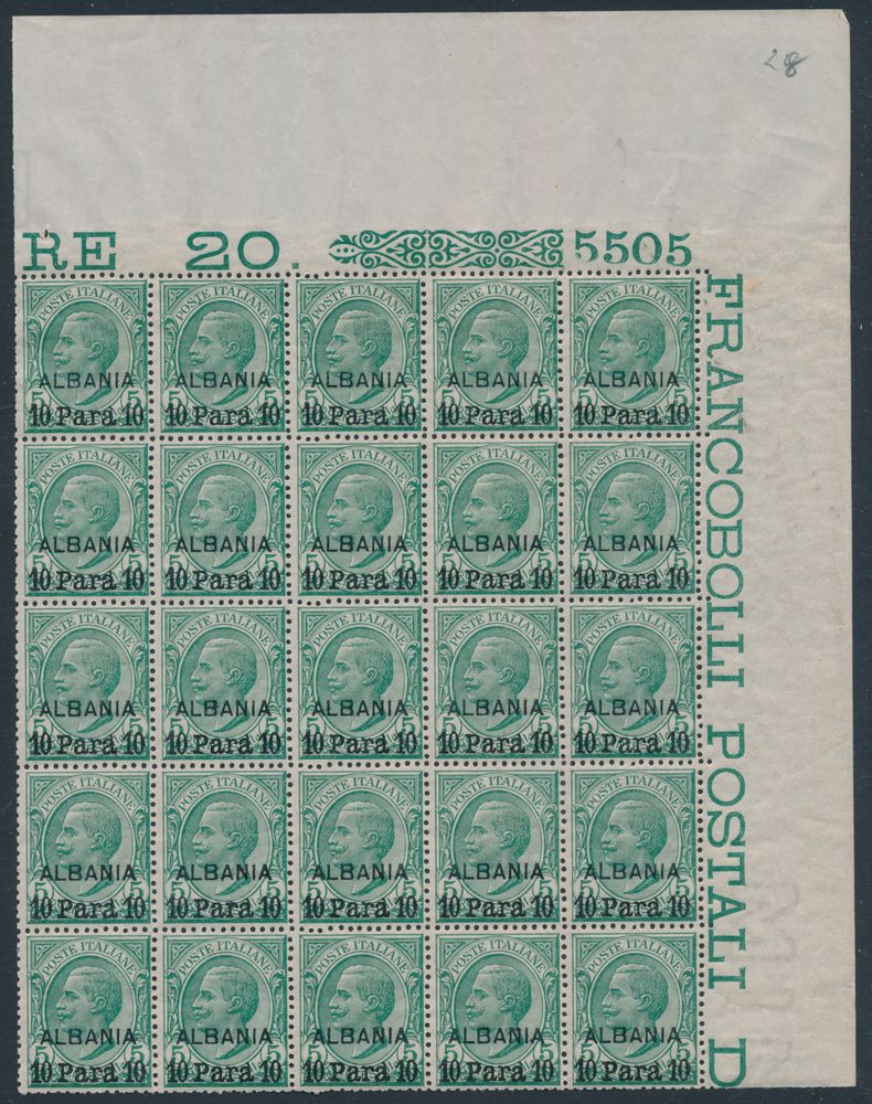 4249 nh imageLEVANT: N° 43A '5c green, overprint Albania- 10 Para' (souvenir sheet of 25 stamps), with corner piece overprint and margin inscriptions, expertised Philipp Kosach (Berlin), vf (Yv. €1,600)(Image 1) (All Images)