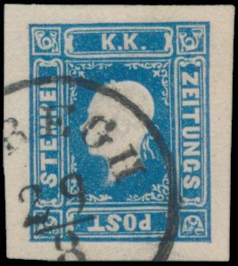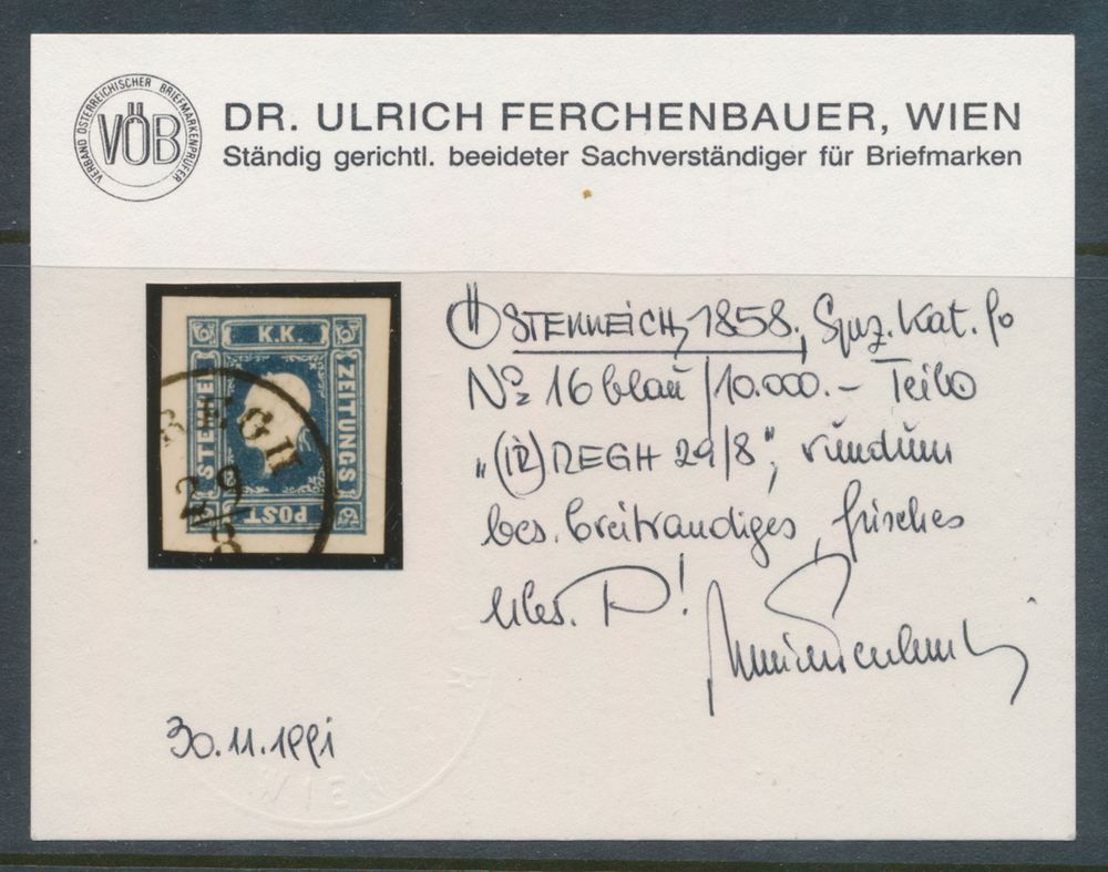 4402 0 imageN° 16 '1858 newspaper stamp 1.05 Kr blue' superb margin,Befund Ferchenbauer, vf (Mi €700)(Image 1) (Image 2)