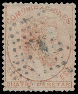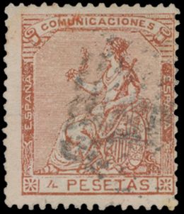N° 138 "1873 - allegory 4 pesetas yellow brown", perf see